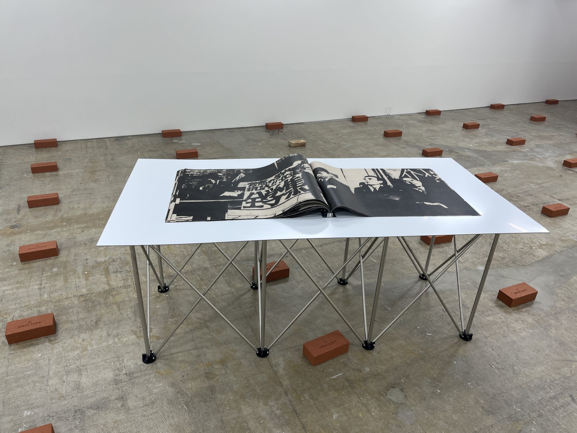 そうした状態の床の中心に大きな机がひとつ置かれ、その上に一片50cmはありそうな大きく横に長い写真集が固定されている。会場にはそれ以外のものが(パンフレットを除いては)何もないことと、机と写真集が一体化した構造から、ページをめくることが企図されているように感じられた。学生闘争の記録らしいことはわかるが、コントラストの強いグラフィカルな写真からは、どこの大学の景色かはわからない。