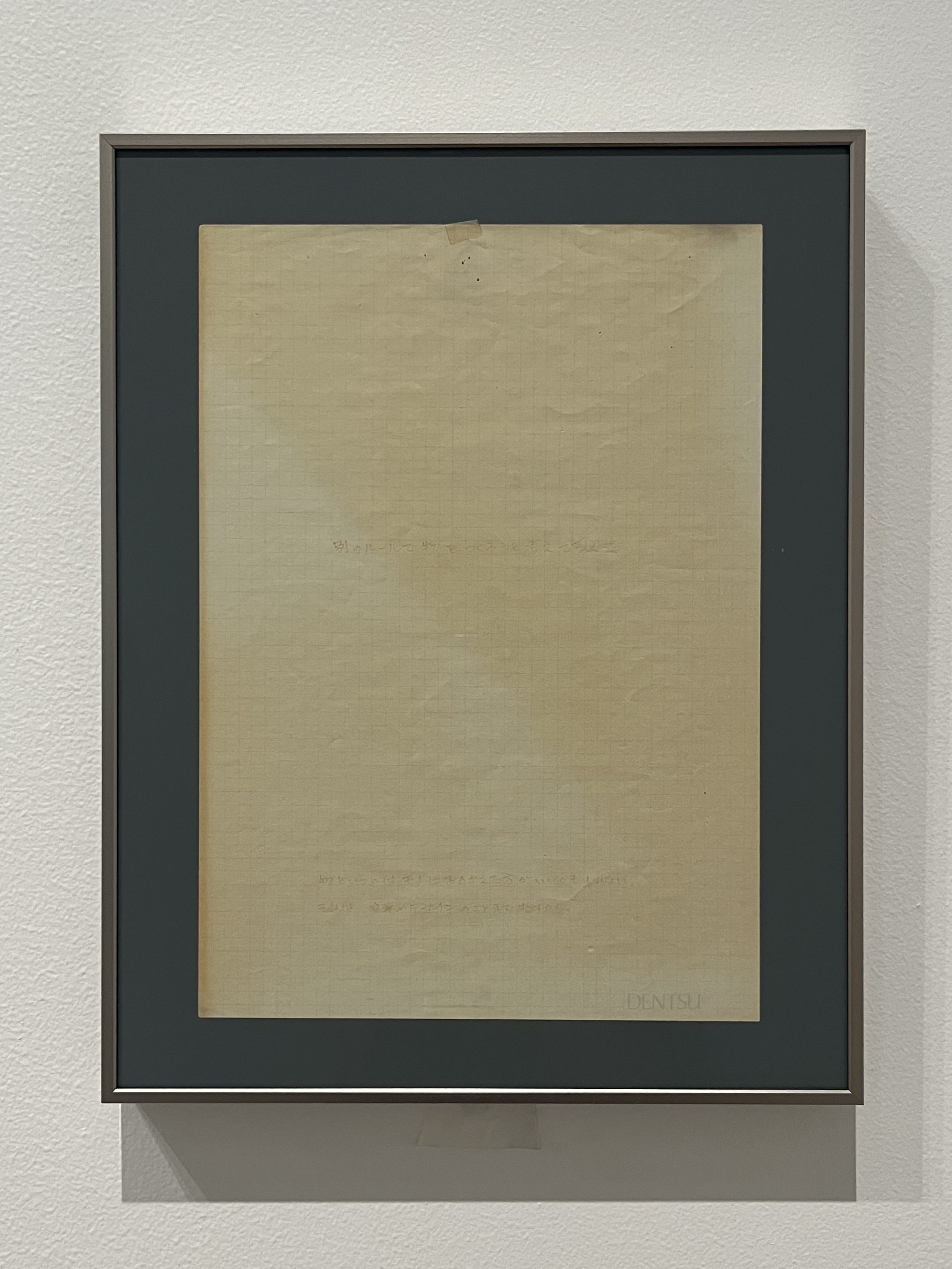 本展は2階展示室の、普段は佐藤の部屋に貼ってあるという一枚のメモから始まる。電通のロゴが入った方眼紙の中心に「別のルールで物をつくろうと考えてる(んだ)」という★3、手書きの筆跡が見える。紙は日焼けし、文字はほとんど消えかかっている。用紙の下部には「物というのはモノにおきかえた方がいいかもしれない」「それは文章やデザインのことも指すから」ともある。佐藤がたびたび言及してきたこのメモは、ルールの「作り方」自体に関心があるという趣向を彼が自覚するきっかけになったもので、本展における最重要出品物とさえいえる。