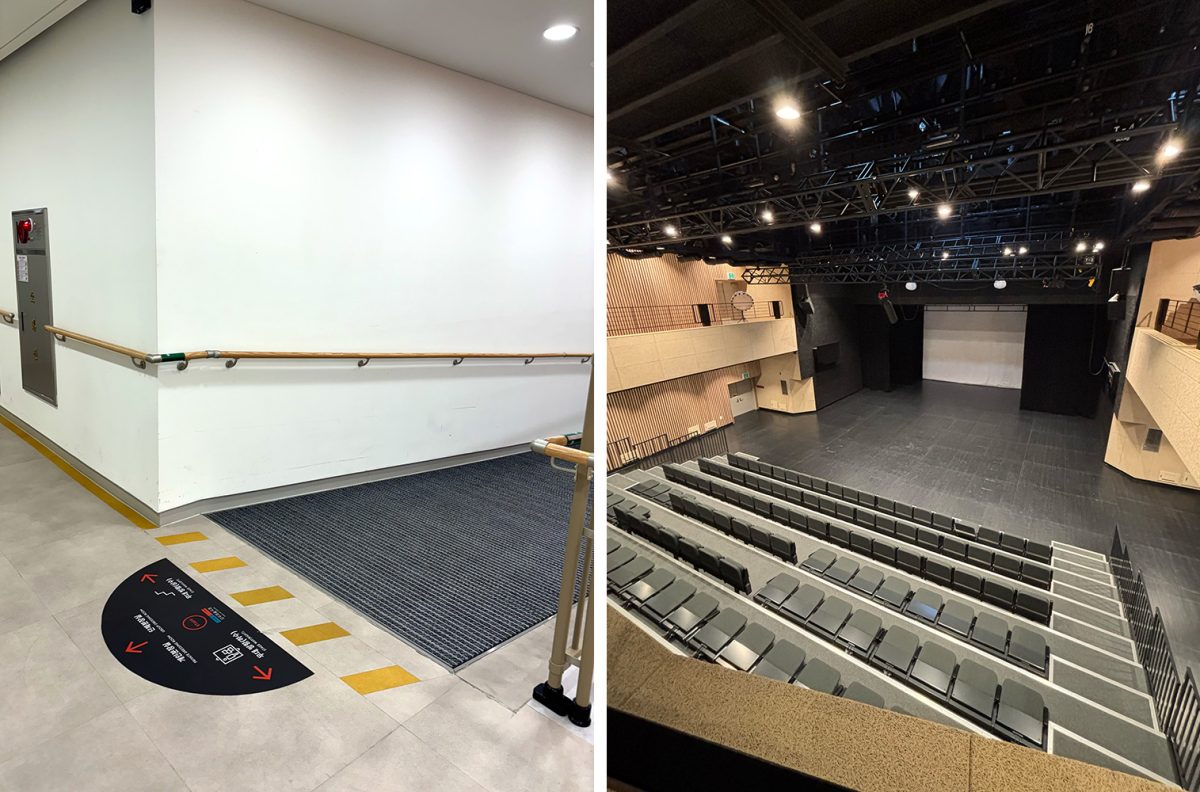 表だけでなくバックステージにも、障害のあるアーティストが使うためのさまざまな工夫が施されている。左の写真に映る手すりを辿れば、視覚障害者もトイレや着替えなどにひとりで行くことができる。柔軟性とゆとりがあり、使いやすい劇場は、一般のカンパニーのレンタルにも人気だそう。