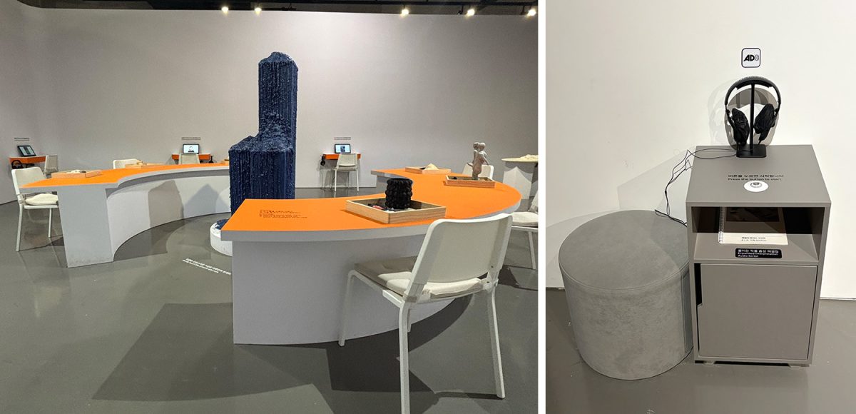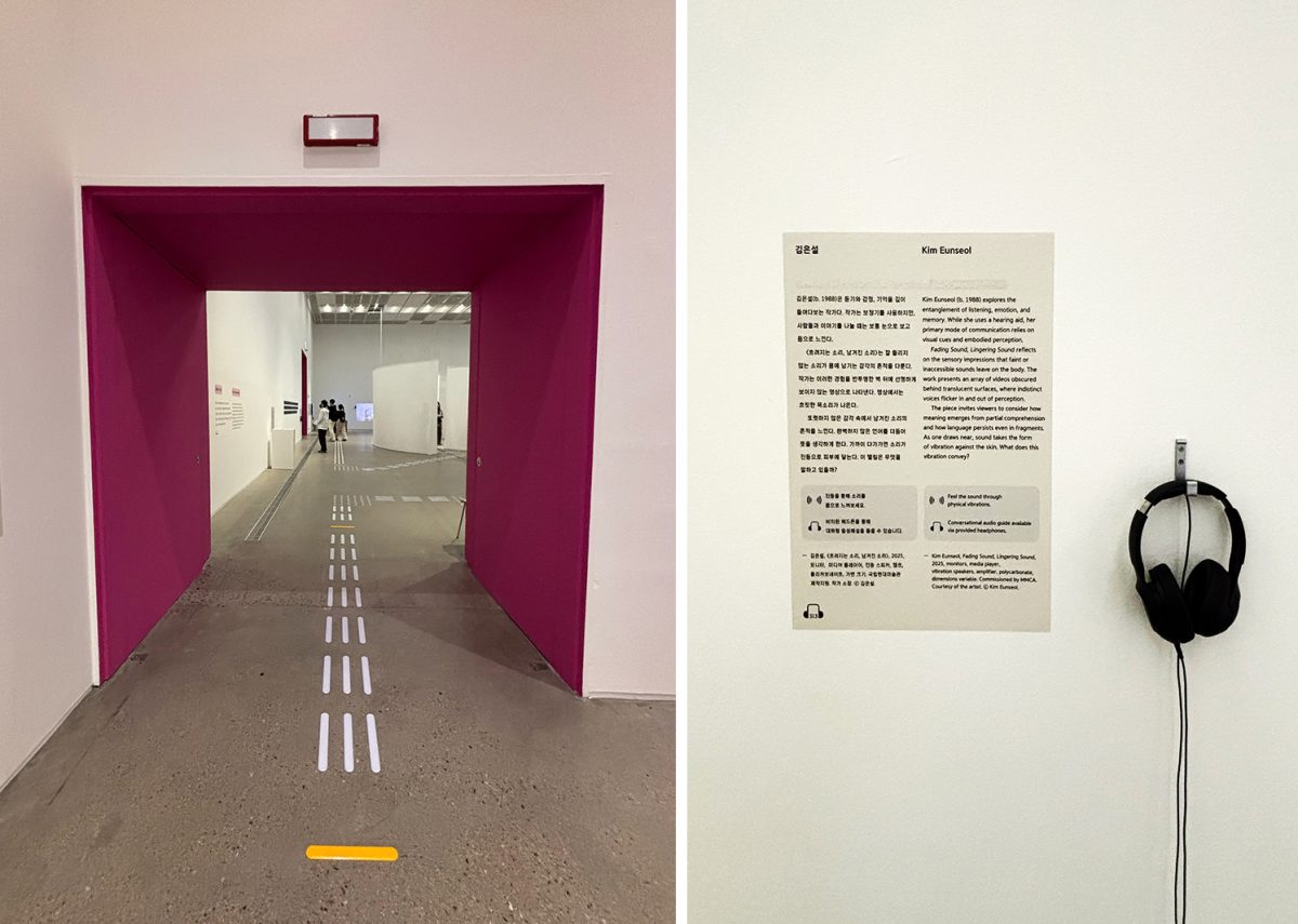 各館ともアクセシビリティの点でも独自の実験的な取り組みが行なわれていた。MMCAの展覧会では、入口に手話での解説動画があるほか、展示室内に独自の点字ブロックが敷かれていたり、各作品に「会話型音声ガイド」が添えられていたり、視覚障害者に向けた工夫が多く見られた。ACCでは、入口にアクセシビリティのコーナーが設けられ、アクセシビリティ・マネージャーが常駐。また、それぞれの作品の横に、どのような感覚で楽しめるかを触覚的に伝えるパネルが添えられていた。釜山には「Sensory Station(感覚ステーション)」と呼ばれる、アクセシビリティに特化した部屋が設けられていたのが特徴だ。また、キャラクターやイラストを用いるなど、展示全体の言葉が美術を専門としない人にもわかりやすく書かれていたのも印象的だった。