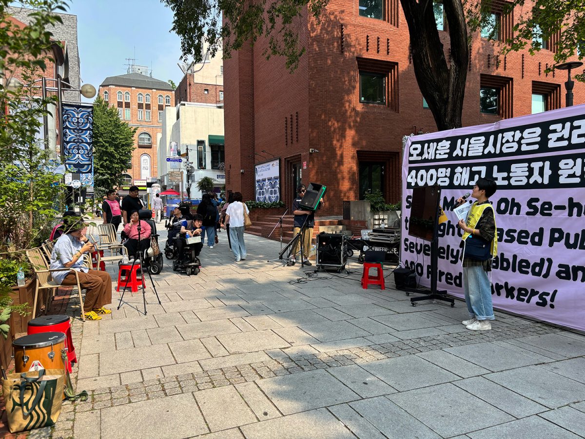 最後に、どうしても書きたい出来事がある。0set Projectが拠点とし、また上記の調査を行なった大学路は、芸術の拠点でもあり、障害者運動の拠点でもある。わたしが訪れた日には、偶然障害のある人たちによるデモがアルコ美術館の前の広場で行なわれていた。障害のある人の表現活動を労働として認めていた制度を、ソウル市長が廃止したことに抗議する趣旨のデモだった。それを見た後に訪れた運動の拠点となる5階建ての建物では、狭いエレベーターの中で車椅子がひしめき合い、あちこちに車椅子をぶつけながら、そんなことは気にも止めず広場に向かって勢いよく出ていく人たちと遭遇した。芸術と権利運動の近さという日本が失っているものを目の当たりにし、思わず目眩がしそうだった。