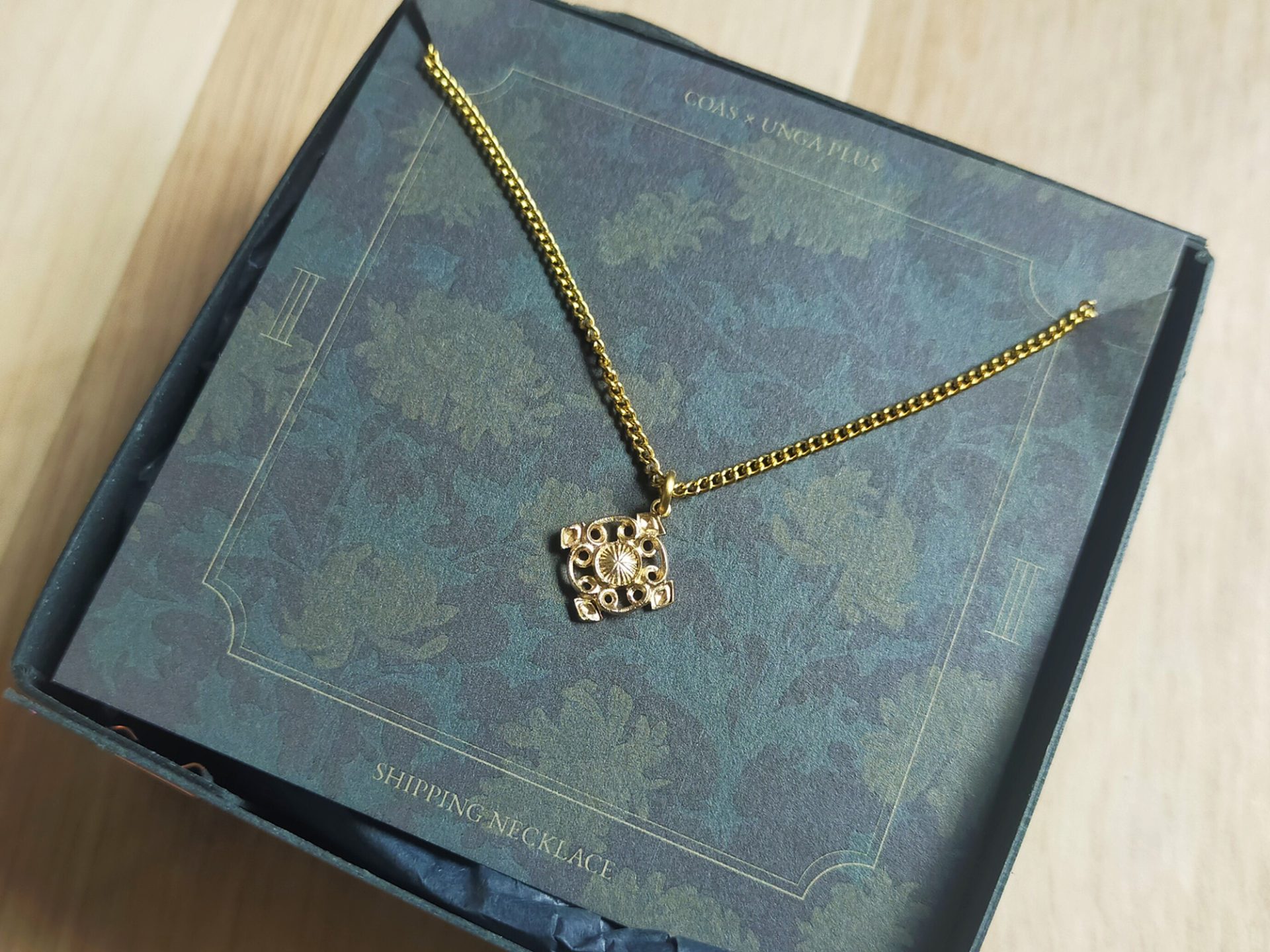 最近のお気に入りは、旧日本郵船株式会社小樽支店(前回参照)のミュージアムショップで購入した「Shipping Necklace Flower」。2階会議室の天井にある中心飾りがモチーフになっている[筆者撮影]