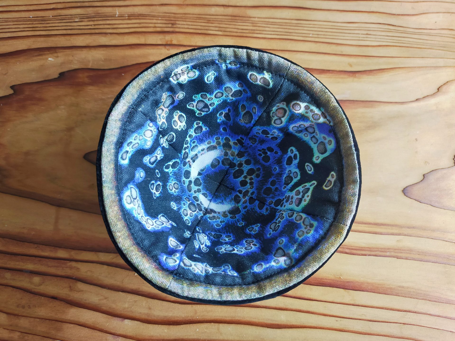 静嘉堂文庫美術館の「曜変天目茶碗」を模した実寸大のぬいぐるみ。展示室で本物を見たあとにやっぱり欲しくなるほど、布地へのこだわりや縫製の丁寧さに惚れ惚れ[筆者撮影]