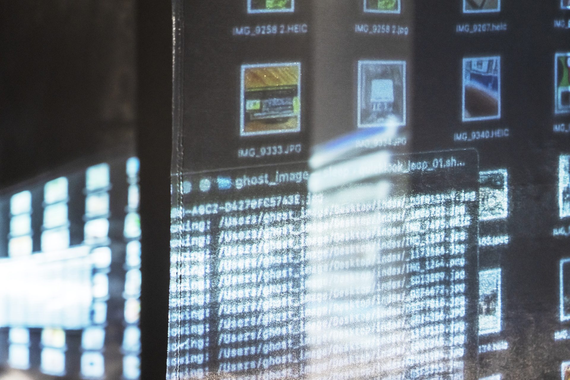 とりわけインスタグラム上で出会ったという近藤央希、上田佳奈、かなまる。による「ゴースト・イメージ」展(会場:ギャラリーヘプタゴン/キュレーション:近藤央希)は作家と作品の対応関係を一切明らかにしていない構成で、スクリーンイメージ★2を主なモチーフとした展覧会だった。会場に入ると風に揺れるオーガンジーのカーテンに人影(人がいたか、影がプロジェクションされていたか、もはやわからない)、その奥からはPCのデスクトップのキャプチャ映像が投影されていた。コマンドウィンドウがデスクトップ表示の半分を占めていて、そこでは無数の「Showing: /Users/ghost_image/Desktop/index/***.jpg」といったような記述が走りつづけ、写真と思しき画像ファイルがどんどんデスクトップに増えていく。