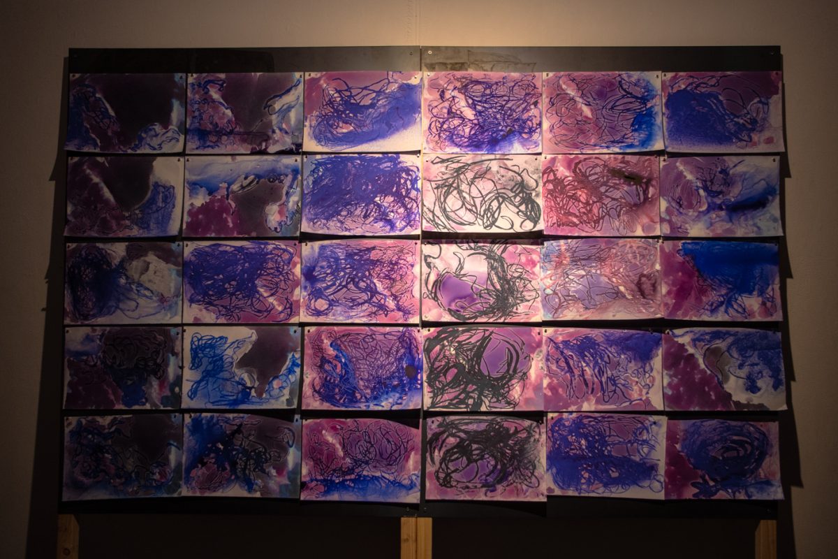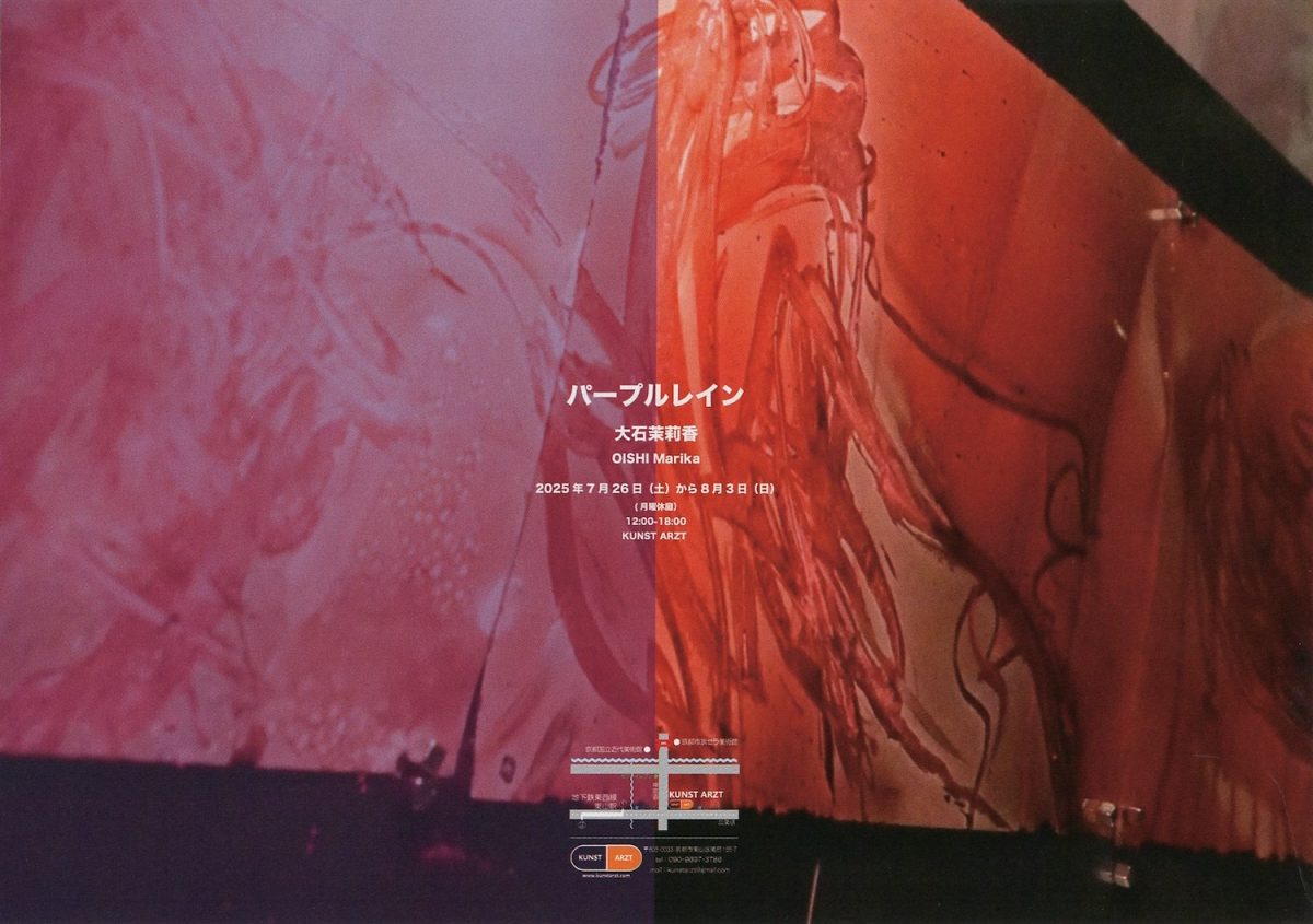なぜ「紫」なのか。大石によれば、理由は2点ある。①紫は唯一、「国旗に使用されない色」であること。昨年の個展で大石は、210カ国の国旗の画像をインクジェット紙の裏面に印刷し、紙にインクが定着していない状態で水に溶かし、「国旗の色」を文字通り混ぜ合わせる行為を作品化した。最終的に、どの国旗にも使われていない紫色に水が染まった。②また、本展タイトルは、プリンスの楽曲『パープルレイン』(1984)に着想を得ている。「紫の雨」とは、「血の雨が降った青空」という破壊的光景の比喩であり、「赤」と「青」という相容れない二極の衝突や融解も示唆する。