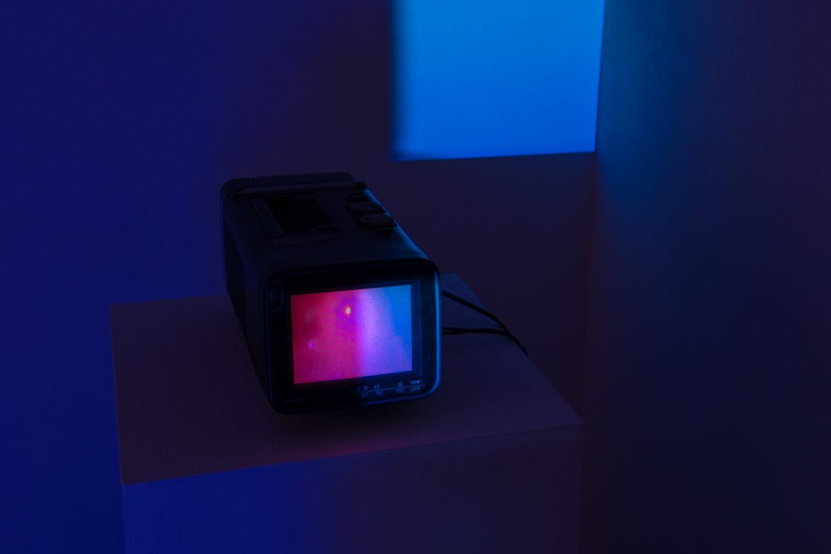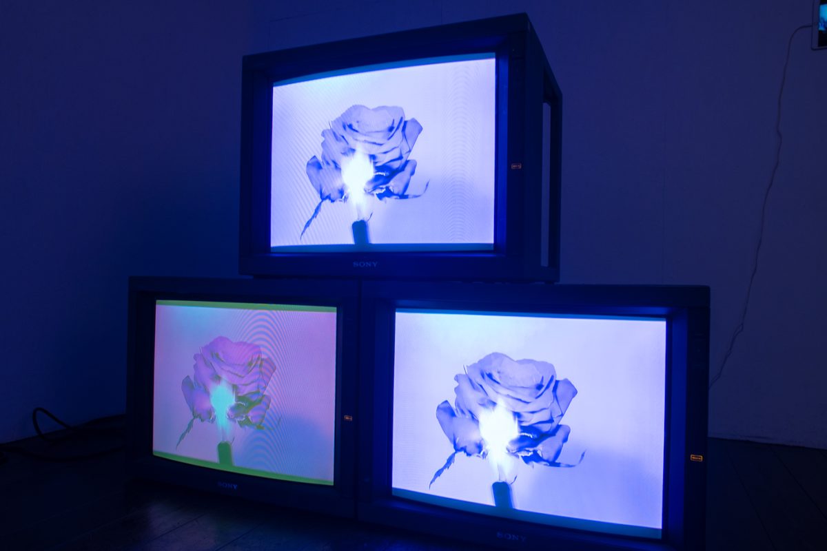 《パープルレイン 花》(2025)では、ピラミッド状に積まれた3台のアナログテレビモニターに、「現在戦争中の国の国花」がガスバーナーの炎で燃やされる映像が淡々と映し出される。ヒマワリ、チューリップ、アネモネ、アイリス、バラ……。3台のモニターに映る映像はみな同じだが、古いアナログ機材のため、しばしば画面が明滅し、帯状のエラーが入り、色調も狂って再生される。加えて、元の映像自体も、「紫色」に加工されている。