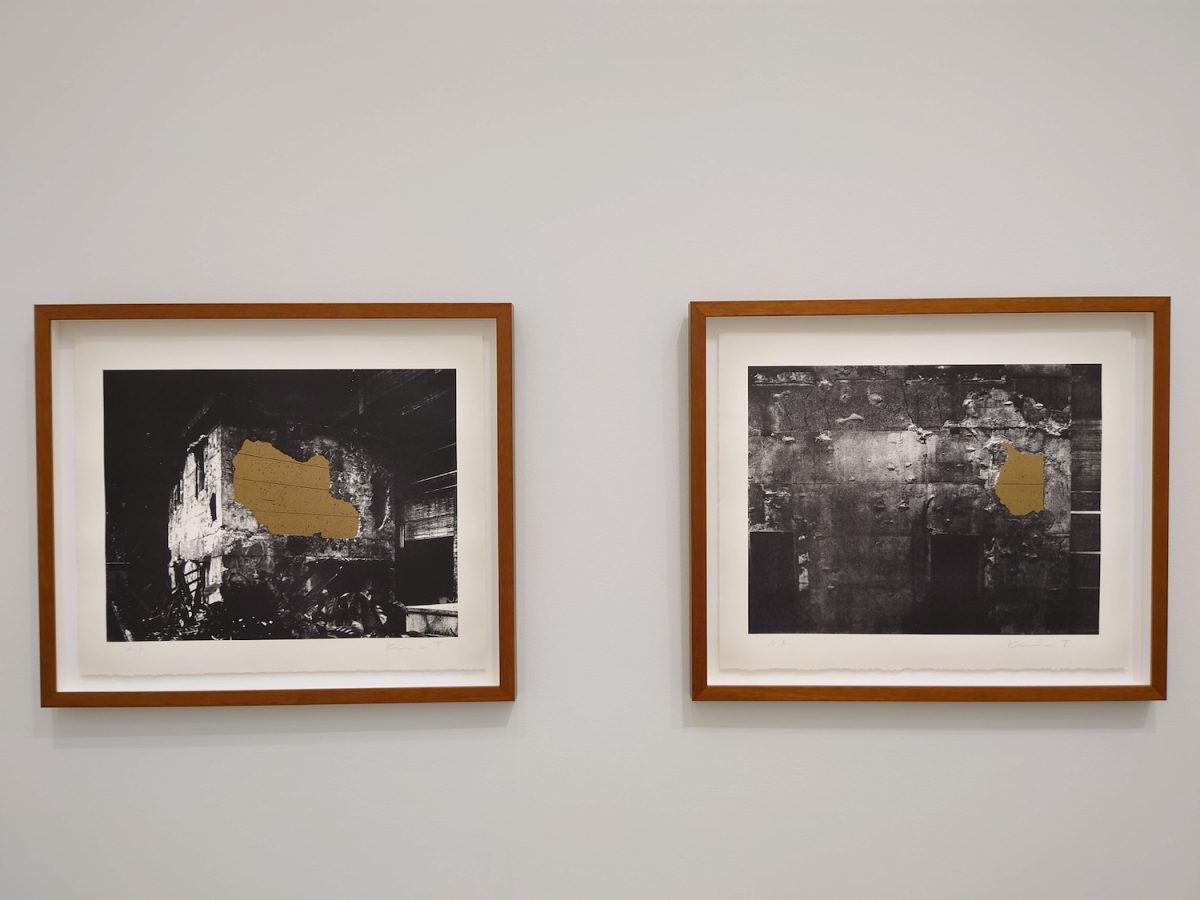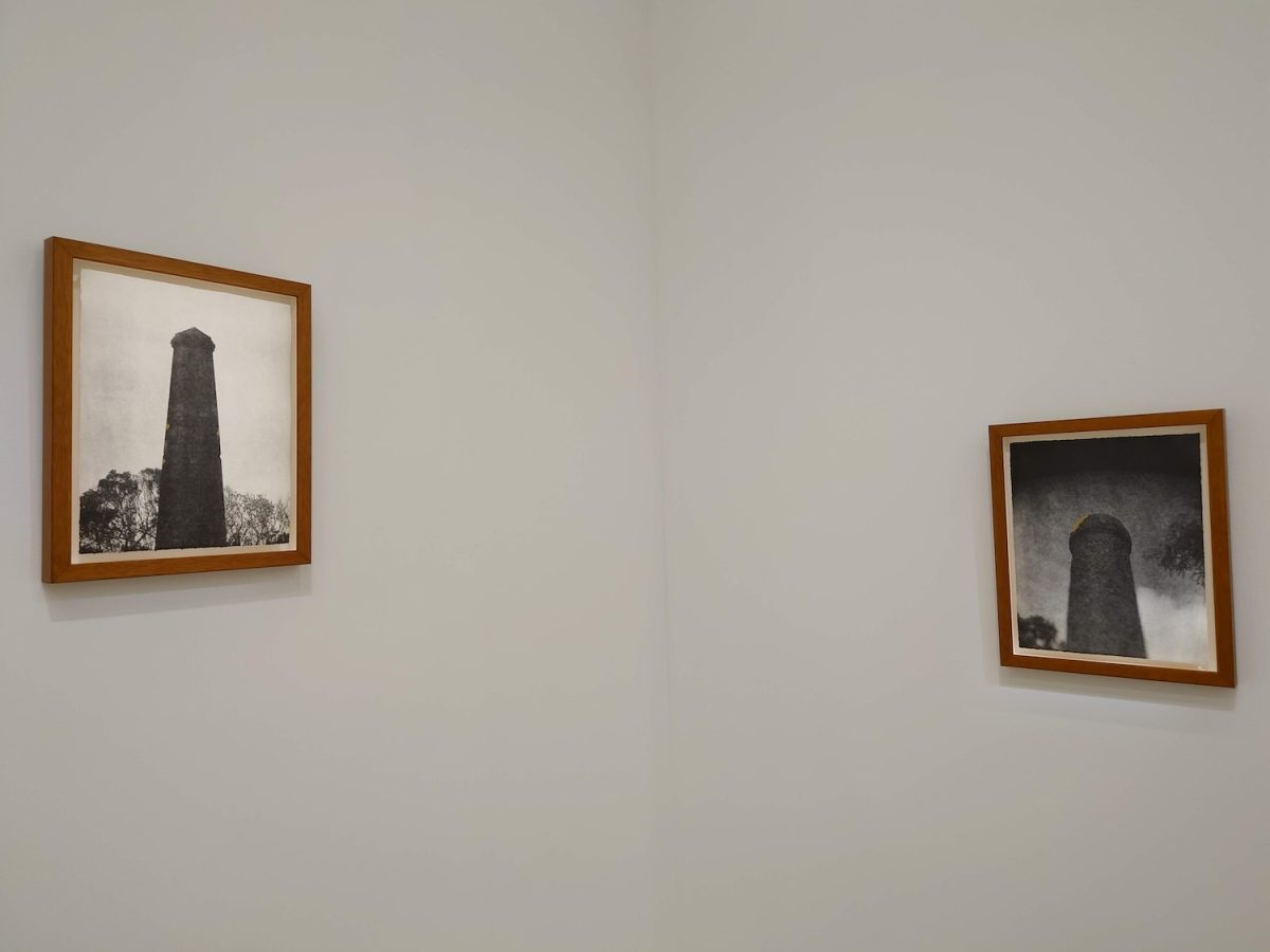 一方で寺田は、出身地である沖縄という土地の記憶を扱ったシリーズ「聞こえないように、見えないように」(2022-)も制作しており、本展ではこちらのシリーズが展示された。「聞こえないように、見えないように」もまた、写真にコンセプチュアルな操作を施すことで、戦前から戦後の占領期を貫く沖縄の歴史の複層性とその見えにくさを浮かび上がらせる作品だ。寺田は、銃痕が残るコンクリートの構造物(監視台)や製糖工場の煙突などを撮影し、リトグラフに刷ったあと、米軍が使用した銃弾の薬莢を細かく砕いて塗料に混ぜ、銃痕の部分に金継ぎのように施した。それは、欠けた傷口を修復しつつ、傷跡自体を装飾として残す金継ぎと同様に、傷を癒すケアの行為でありつつも、「そこに傷跡があること」を消去するのではなく、違和感や物理的痕跡として指し示す。