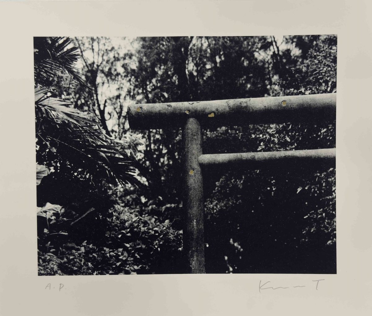 寺田の作品における「ストゥディウム」としての明示的な意味が、「戦争遺構や近代産業化の象徴である製糖工場跡に残る沖縄戦の痕跡」であるならば、遅れて発見され、見る者をまさに刺し貫くような「プンクトゥム」は何に相当するだろうか。本シリーズの要諦は、銃痕を撮影し、穴を開けられた被写体に「神社の鳥居と狛犬」が含まれていることだ。「沖縄の風景に鳥居があること」は、一見、とりたてて注目すべき点のない、ごく当たり前の風景に思えるかもしれない。だが、これらは、戦前に、沖縄神社(首里城内に設置)や護国神社などの創建に加えて、沖縄の聖地である