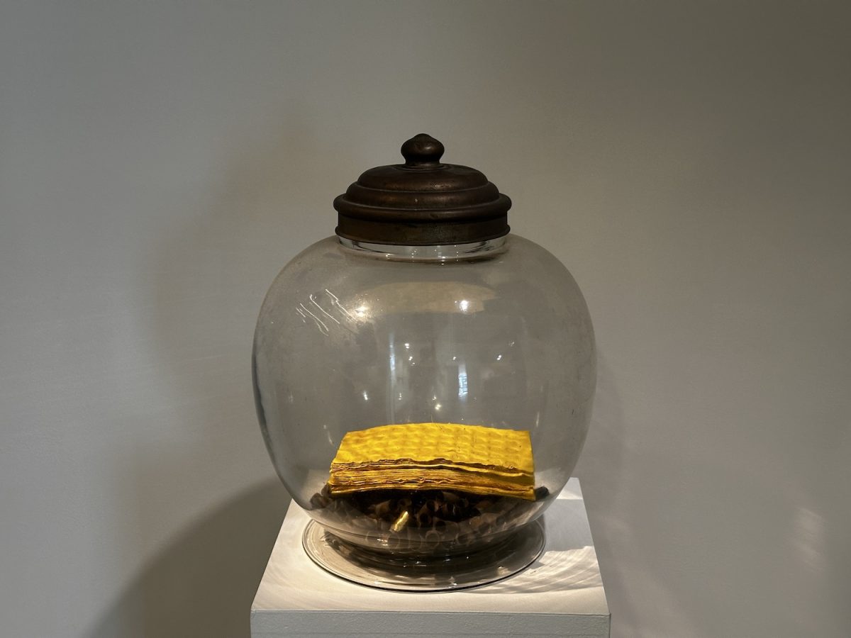 また、「米軍が使用した銃弾の薬莢の再利用」と沖縄の戦後史の関連にも目を向けたい。展示空間の冒頭には、黄色い紙に丸いエンボスを施したシートの束と、薬莢がガラス瓶に詰められている。沖縄では、黄色い紙に銭の形のエンボスを施した「うちかび」という冥銭を、死者があの世で使用できるよう、お盆などで燃やして供える風習がある。寺田は、物資不足の戦後期に米軍の薬莢を用いてエンボス加工したうちかびがつくられたことをインスタレーションとして再現するとともに、「金継ぎの素材の代用品」として薬莢を使用した。うちかびに限らず、アメリカ占領期の沖縄では、米軍の廃品を再利用してさまざまな生活道具がつくられた(例えば、現在、沖縄の土産物の定番である「琉球ガラス」は、米兵が捨てたコーラや酒のガラス瓶を砕いて溶かし、再利用したものがルーツである)。また、現在も手に入る薬莢は、本土返還後も残る基地の負担の証人である。