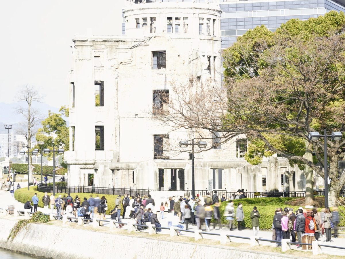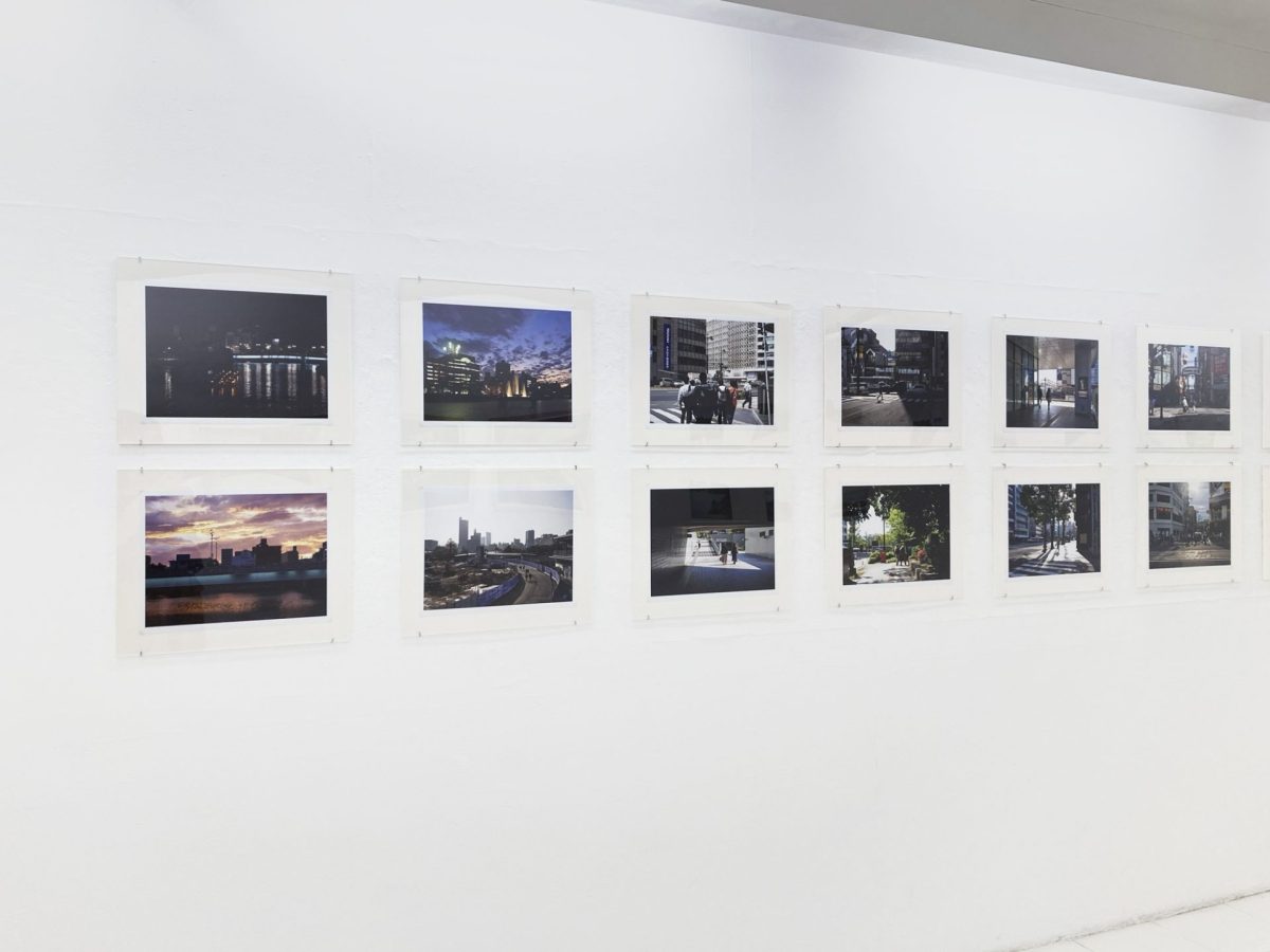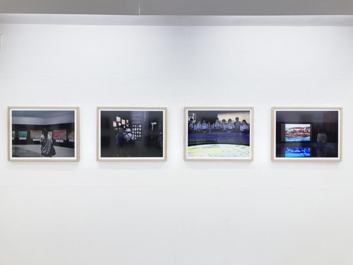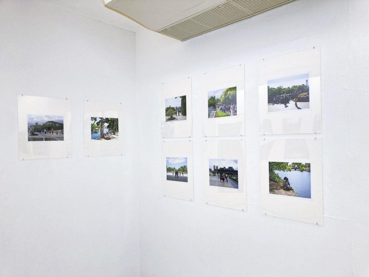 また、別の一枚では、外国人観光客と思しき人々の背後から、彼らの視線の先にある原爆ドームが画面中央に写される。資料館内と同様、「見る人」を入れ子状に写すことで、資料館の正面に立ち、原爆慰霊碑のアーチの先に原爆ドームを望むという、丹下健三が設計した公園の軸線が強調される。だが、周囲の花壇には折り鶴の巨大なオブジェが置かれ、原爆ドームと並んで、屋上展望台を備えた「おりづるタワー」も写っている。原爆ドームへ視線を誘導する軸線上で撮影すると、おりづるタワーも不可避的に写ってしまうこと。「ヒロシマ」の写らなさや見えにくさという諦念ではなく、広島という現実の都市が観光地として変わりゆく事態を記録すること。シリーズの継続の意義がここに感じられた。
