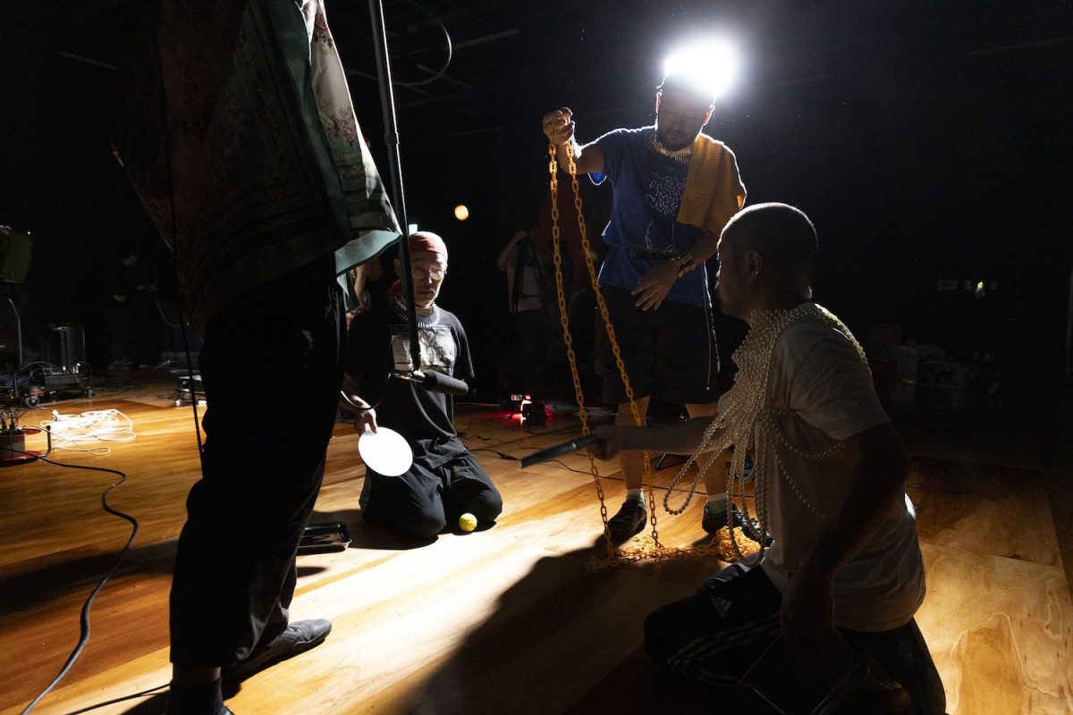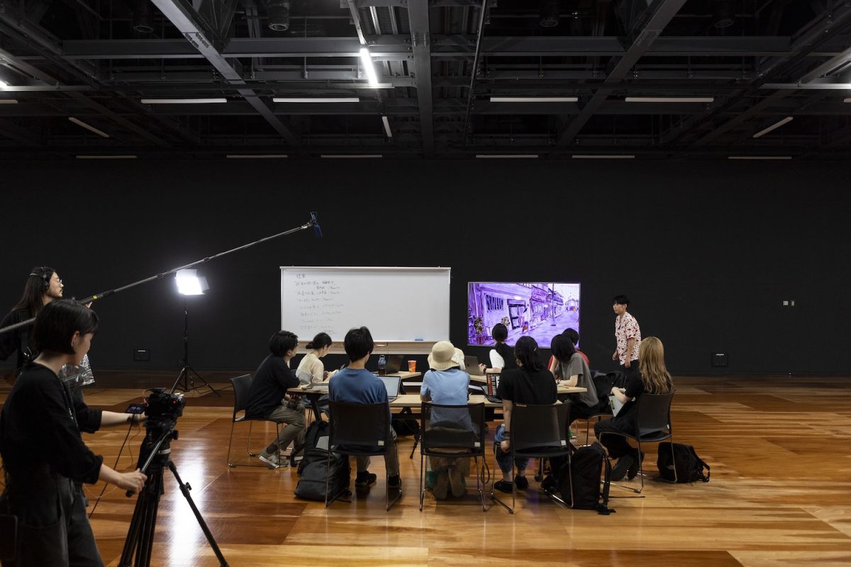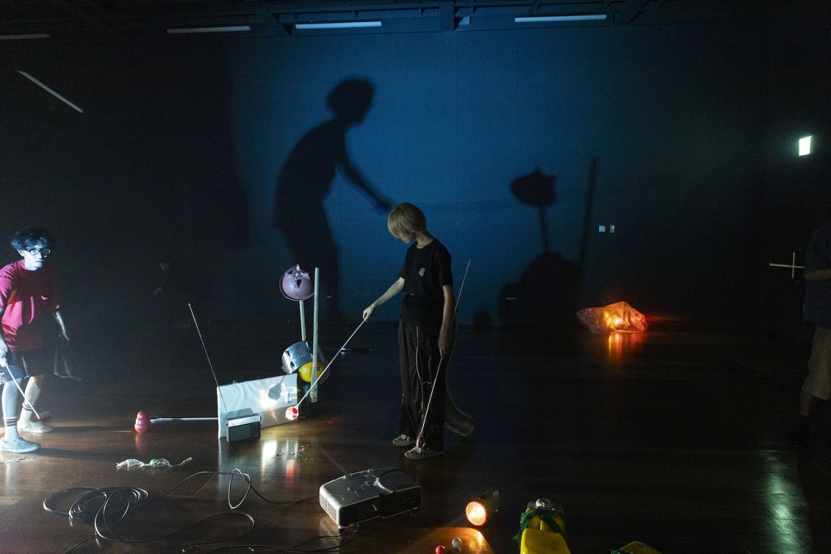 3回目のワークショップは、舞台芸術の作品上演のための設備をもつ、黒い壁面の空間である多目的ギャラリーで実施した。「C:創造と場の『演出』」のプログラムの中盤からは、金氏徹平「tower(UNIVERSITY)」(仮)(2025/12/13-2026/02/15実施予定)の展覧会をつくる過程自体をパフォーマンスとし、記録撮影して作品化することから「演出」のあり方を学ぶ。このワークショップは、今後の展開に向けてのウォーミングアップとして、金氏が舞台作品で実際に使用してきた小道具を用いて行なわれた。