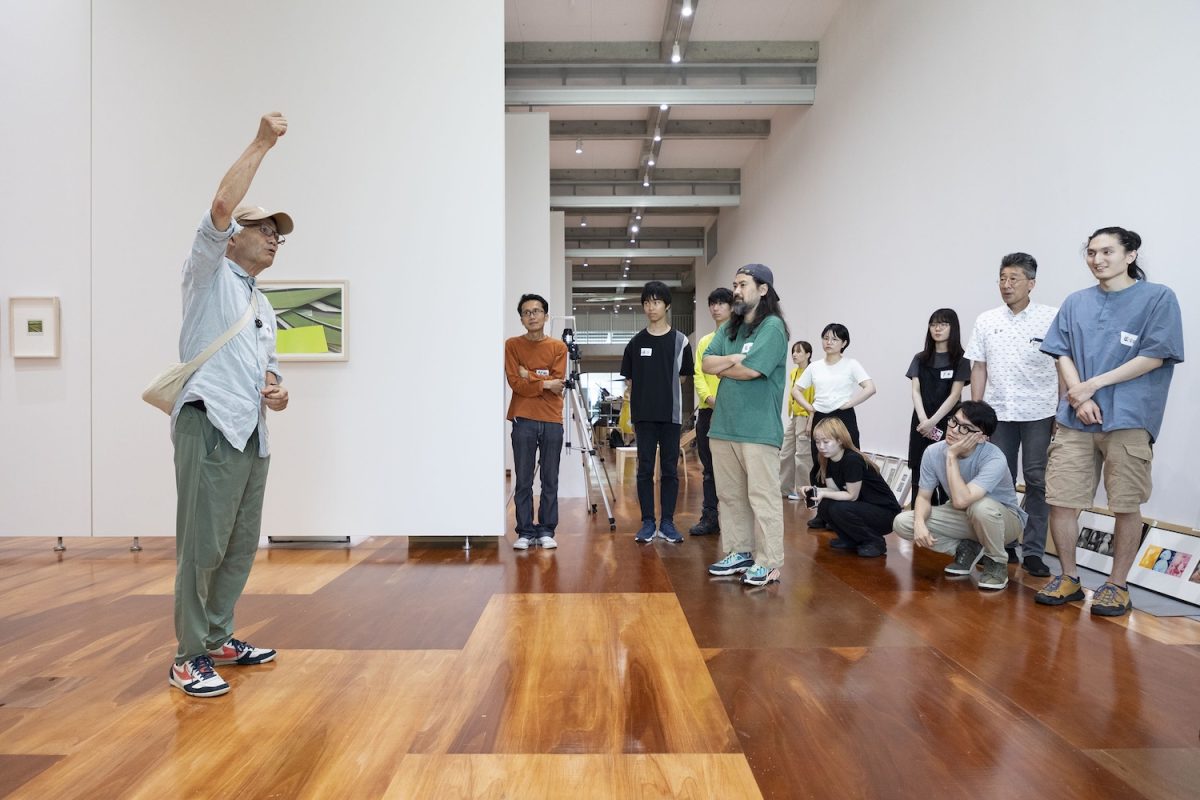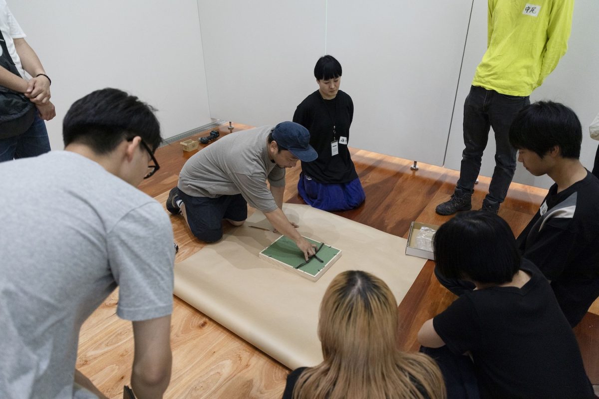 作業に入る前に、彫刻家の中ハシ克シゲによる、作品と空間との関わりをテーマとしたレクチャーを行なった。スライドで実例を示しながら、彫刻と台座(あるいは絵画と額縁)、そして空間との関係についてが、丁寧かつ真摯に語られていく。インスタレーションとは、たとえば複数のオブジェをいい感じに置いたようなものではない、その場の状況を変える力を持つもののことだ、という中ハシの言葉は、この後に続く展示作業のワークショップに適度な緊張感を与えるものだった。