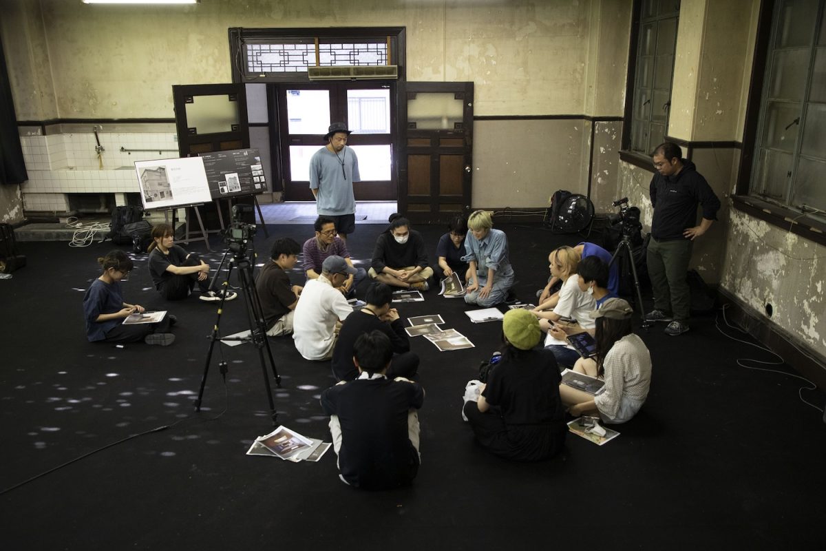 翌日に行なわれた2回目のワークショップでは、中ハシ克シゲのファシリテートのもと、大学敷地内の屋外のスペースならびに東本願寺の関連施設である重信会館(1930年築)という、まったく異なる2つの空間での作業を行なった。