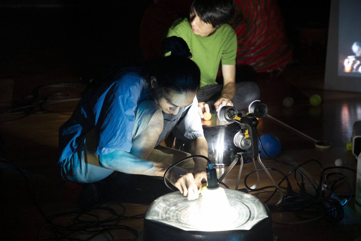 空間のあちこちで、各々が思い思いに物を運んだり、即興的なコラージュで構造物を作り上げたりしている。最初は小道具の整理や機材の確認などの作業をしていたスタッフも、いつの間にかそれを使って何かする方に転じてしまったようだ。ふいに、誰かがどこかに光を当てると、暗闇のなかにまた別の誰かの姿が浮かび上がる。不思議なことに、全員が楽しそうに飽きることなく延々と動き続けていた。そうして、シナリオのないパフォーマンスが、2時間延々と行なわれたのだった。特に何の指示をしたわけでもなく、自然にこのような状態が生まれたことについては、金氏自身も驚いていたほどだ。ほんの少しのきっかけがあれば、ものの見え方は変わり、役割の反転も可能だということを実感できたという意味で、この実験は大成功だったと言えるだろう。