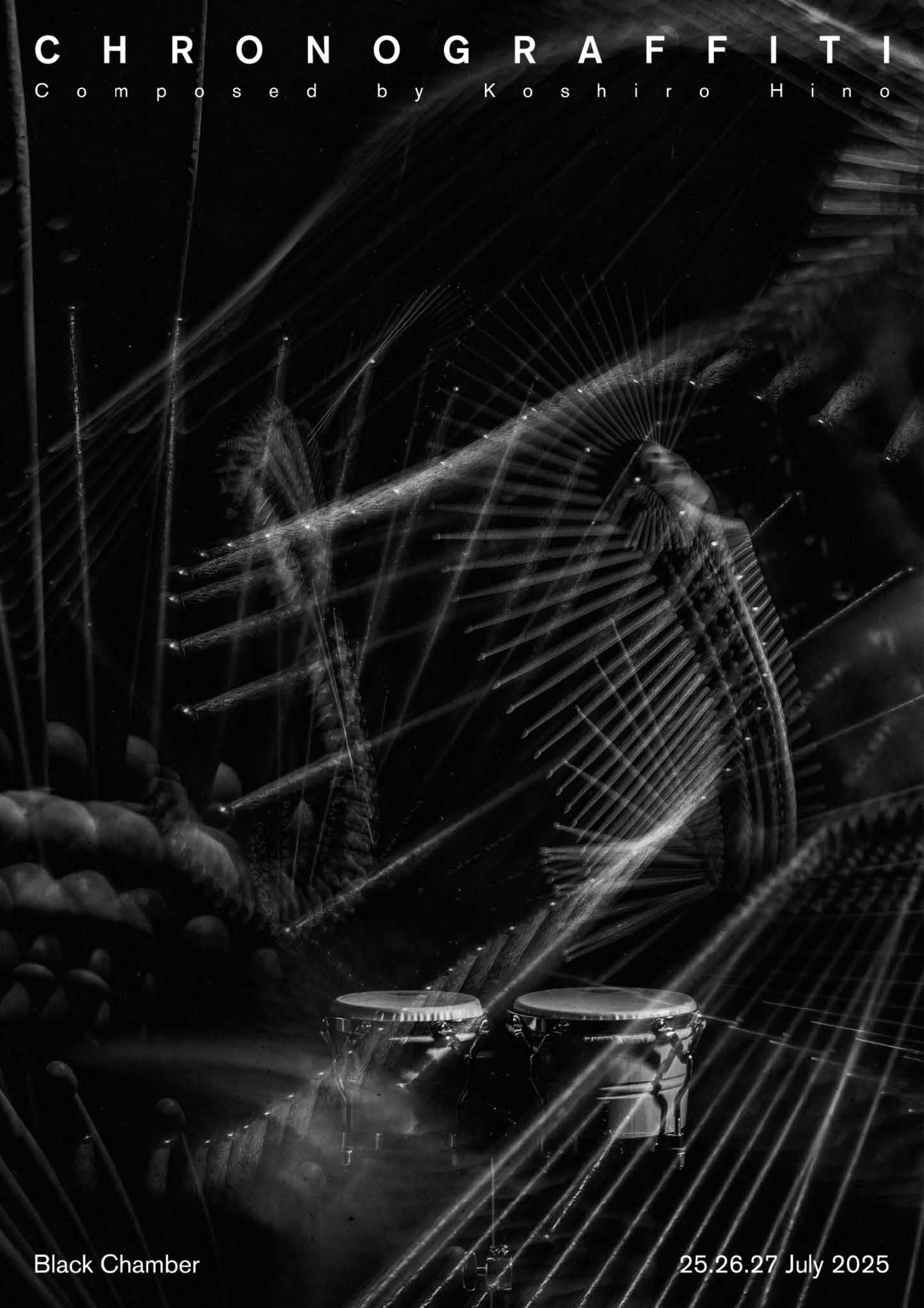 このあまりにも根源的で当たり前な身体の身振りを、現代的なテクノロジーと研ぎ澄まされた作曲技法によって見つめ直し、新たな知覚の地平を切り拓いたのが、音楽家・日野浩志郎による新作《Chronograffiti》である。2025年6月、ドイツのMoers Festivalからの委嘱により世界初演された後、7月にクリエイティブセンター大阪内のBlack Chamberにて待望の日本初演が行なわれた。ステージに立つのは、元・鼓童の中心メンバーである前田剛史、日本管打楽器コンクール第一位の実績を持つ安藤巴、そして昨今の日野の作品に頻繁に参加してきた谷口かんなという、現代日本の打楽器シーンを代表する三名のソリストである。そして、ダムタイプへの参加でも知られるアーティスト/プログラマーの古舘健が、ヴィジュアル・エフェクトを手掛ける。