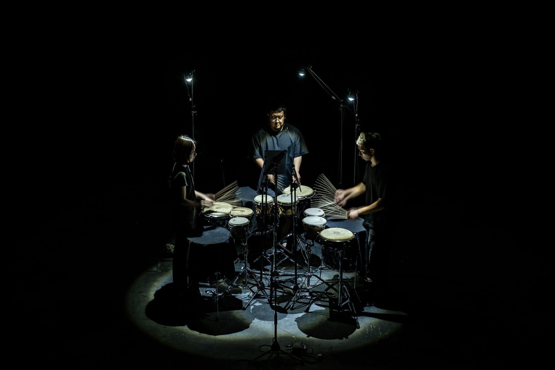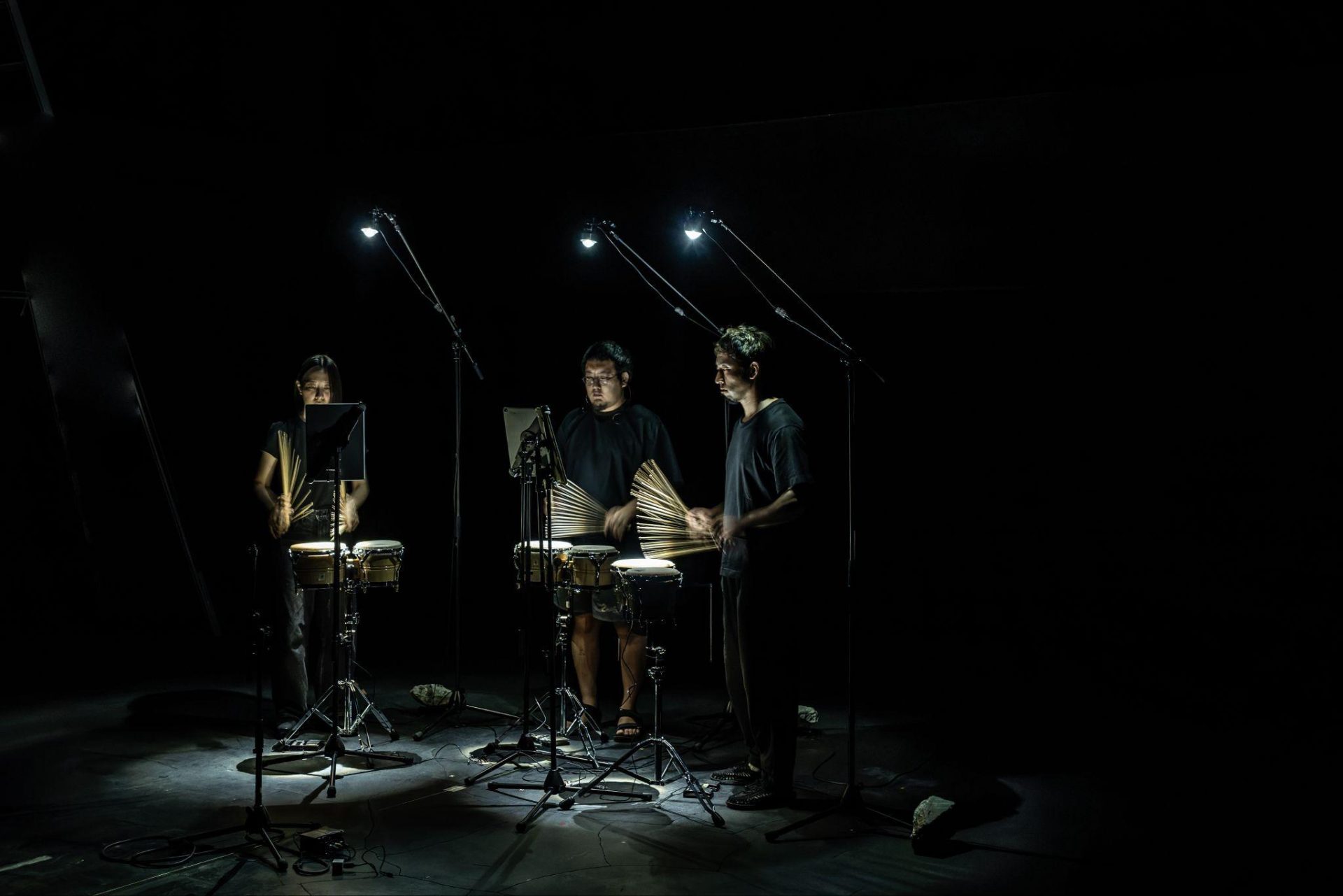 会場に足を踏み入れると、ステージはあらゆる装飾が削ぎ落とされた空間だった。中央に等間隔で並べられた三台のボンゴと、それぞれの奏者の手元を照らす簡素な照明器具。しかし、いわゆるセンサーやカメラ類は一切見当たらない。私は当初、人間の動きをデジタル集積し、リアルタイムで制御するアプローチを想定していたので、このミニマルな構成は意外であった。客電が落ち、前田、安藤、谷口がそれぞれの楽器の前に立つ。開幕と同時に、三者は高速かつ均等なパルスでボンゴを連打し始めた。