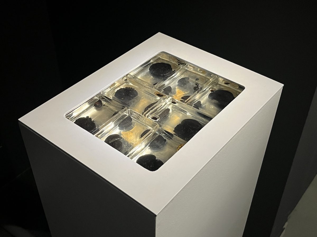 ところが、チケットを見せたあとの第1展示室に現われるのは、石。宇宙から落ちてきた隕石のような物体。AIの展覧会なのに?