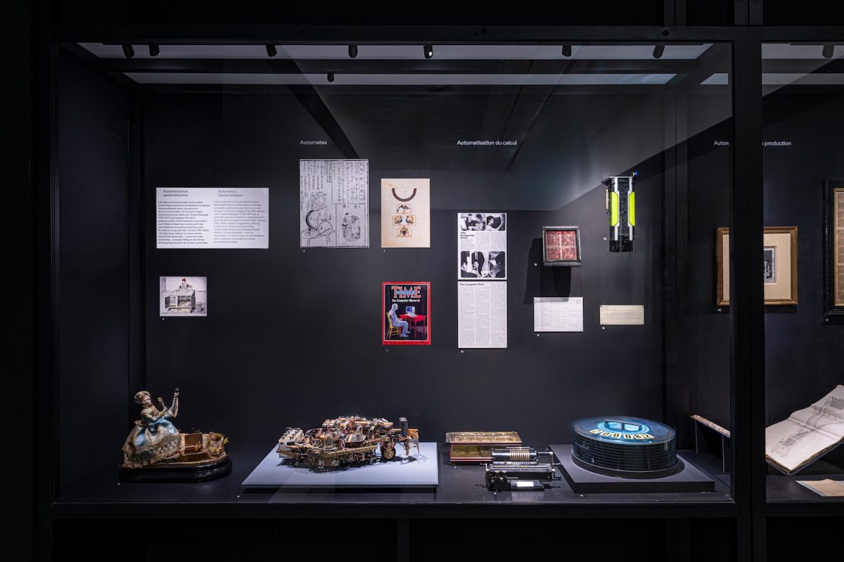 さらにこの展覧会には、ときどきタイムカプセルと名付けられたガラスケースの展示が現われる。その中には、「突然変異のように現われたAI」というイメージを覆す、発展の歴史的証人としてのオブジェが置かれているのだ。この展示室では、機械仕掛けの人形、計算機やパンチカード、軍事用機材、コンピューターといった資料が整然と並んでいた。これらの発明の歴史をたどったからこそ、AIが誕生したことを実感できるのだ。