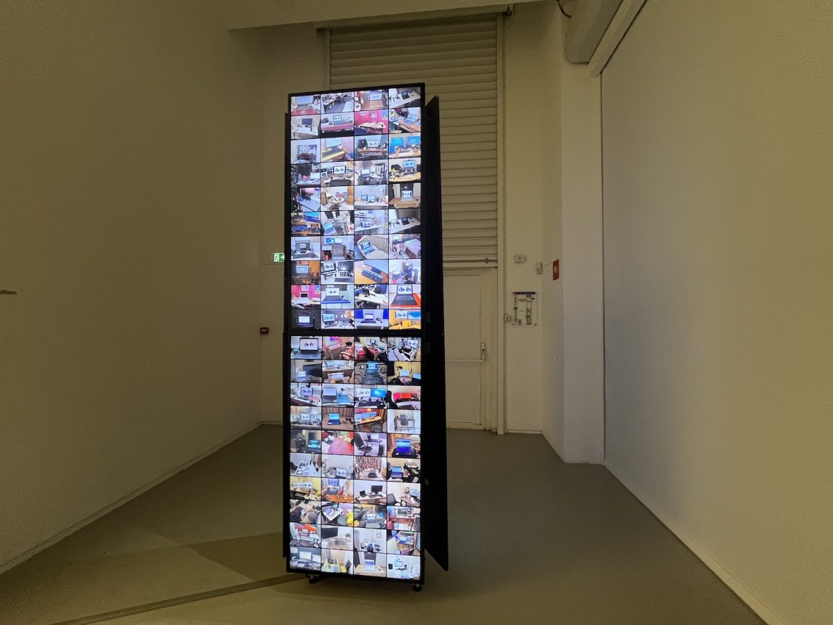 次の展示室では大きな画面に、夥しい数の「机とコンピューター」の映像が映る。これはメタ・オフィスの《micro-travail》。これもさきほどの「タグ付け労働者」の話だ。何百人もの人々が、オンラインコンテンツを識別して分類したり、画像のオブジェクトにタグ付けしたり、暴力的コンテンツを削除するために働いているのだ。実は、AIの背後には、無数の見えない「ゴーストワーカー」が存在している。この反復作業の賃金は非常に低く、私たちのクリックひとつの裏に存在する人間の姿と経済的格差を浮かび上がらせる。