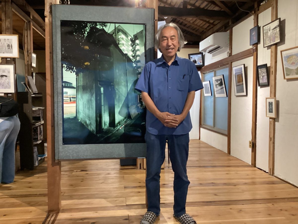 「東京原風景 サブが居た街」展での中里和人[筆者撮影]