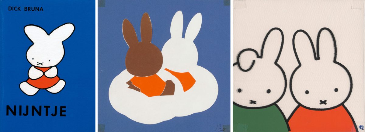 左:『ちいさなうさこちゃん』(初版、1955) 中央:『うさこちゃんのゆめ』(印刷原稿、1979) 右:『うさこちゃんとたれみみくん』(印刷原稿、2006)