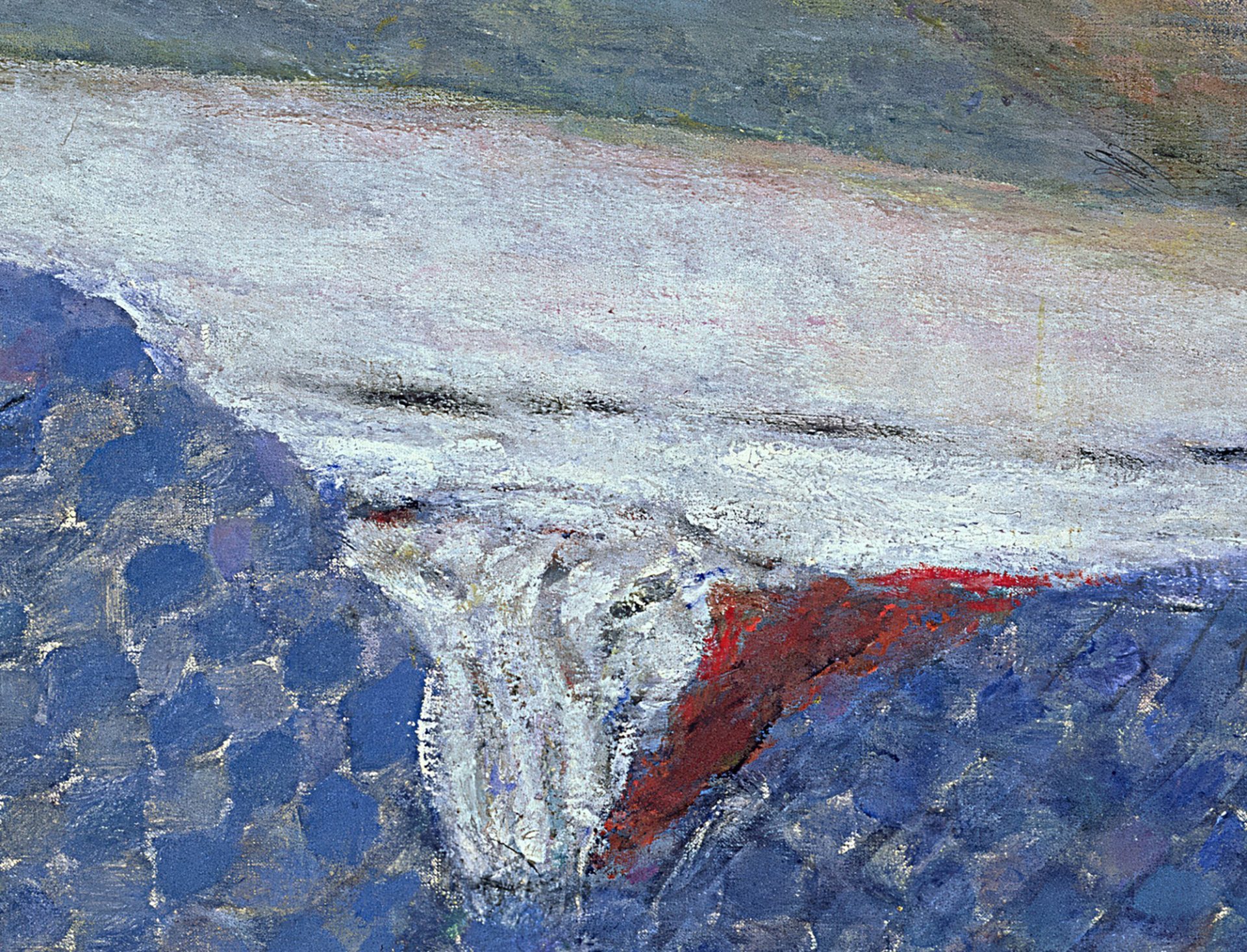 「浴室の裸体」シリーズのひとつで、もっとも虹色に富んだ作品。妻マルトの裸体が浴槽に浸かる様子を描いた。「もうこんな難しい主題に取り組むことは二度とないだろう。自分が望むようにはいかないのだ。もう半年も取り組んでいるが、まだ数か月はかかるだろう」(永澤桂『ピエール・ボナールの自画像と「浴室の裸婦」の主題をめぐって』p.72)とボナールは言ったという。光の無数の反射は、キャンバス全面に色彩の反響を広げ、シンプルな白いタイルを魅惑的な光彩の支持体へと変えた。その壁の四角いタイルは、戸外の陽光を反映しながら色彩豊かに歪み、空間と時間を現実の世界から切り離している[図1]。また猫足の付いた簡素な陶器の浴槽[図2]に肢体を横たえるマルトは、顔が曖昧で身体も光のなかに溶け込み個性を剥奪されたかのようだ。当時60歳を超えていたマルトは、実年齢とは裏腹に若々しく、永遠に老いることのない彼岸の住人のようでもある。浴室全体が光と色彩で響き合い、水晶体の内部に似て美しく夢幻的で、現実の空間が神話的な世界に変貌している。ボナールは亡くなる前年、言葉を残した。「要は、生きた対象を描くのではなく、絵画を生きたものにするということである」(『もっと知りたいボナール 生涯と作品』p.69)。非物質的な輝きを、浴室を構成する固体と、流動体の要素とを等しく扱い、それらを調和させて、絵画をいきいきと自立させたボナールの代表作である。