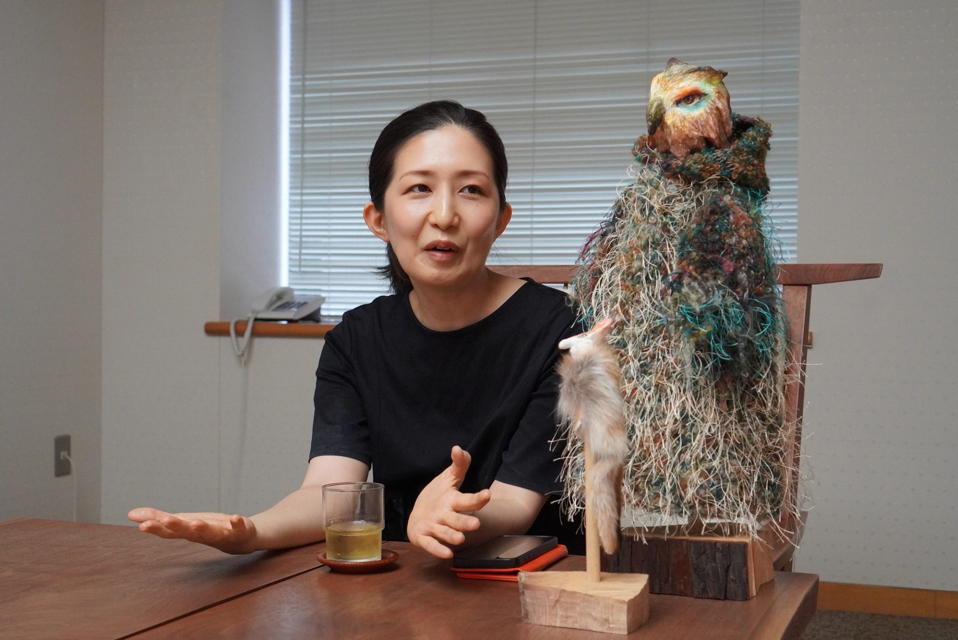 石田智子さん。手前の作品は鴻池朋子《指人形》(2023−24)[撮影:artscape編集部]