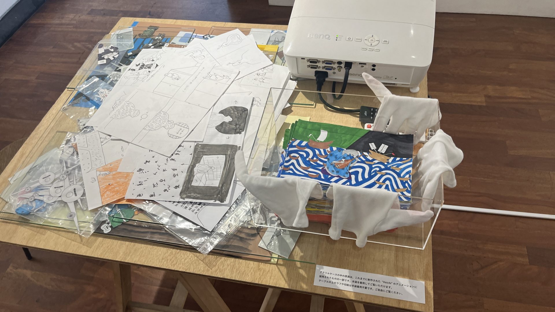 2014年頃、土屋のVimeoアカウントに『Hoichi』冒頭の映像がアップされて以来★1、短編アニメーションの愛好家は約10年間にわたって定期的に彼のサイトを訪れ、この作品の続報を追い続けている。2021年以降は新千歳空港国際アニメーション映画祭や文化庁メディア芸術クリエイター育成支援事業で、その制作過程を窺うことができたが未だ完成には至っていないようだ。そうした作品の、最新の「途中経過」を公開する展示である。