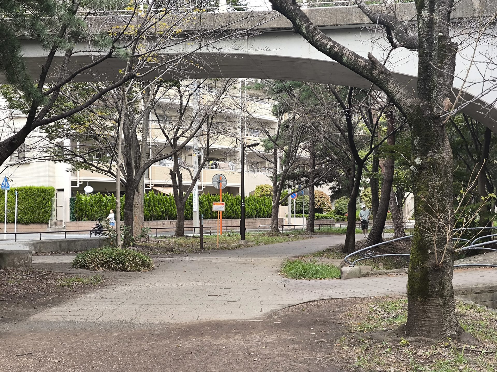 スタート地点の様子。ルートはニュータウン内を広域につないだ遊歩道で、公園や公営の施設、学校などが隣接する[筆者撮影]