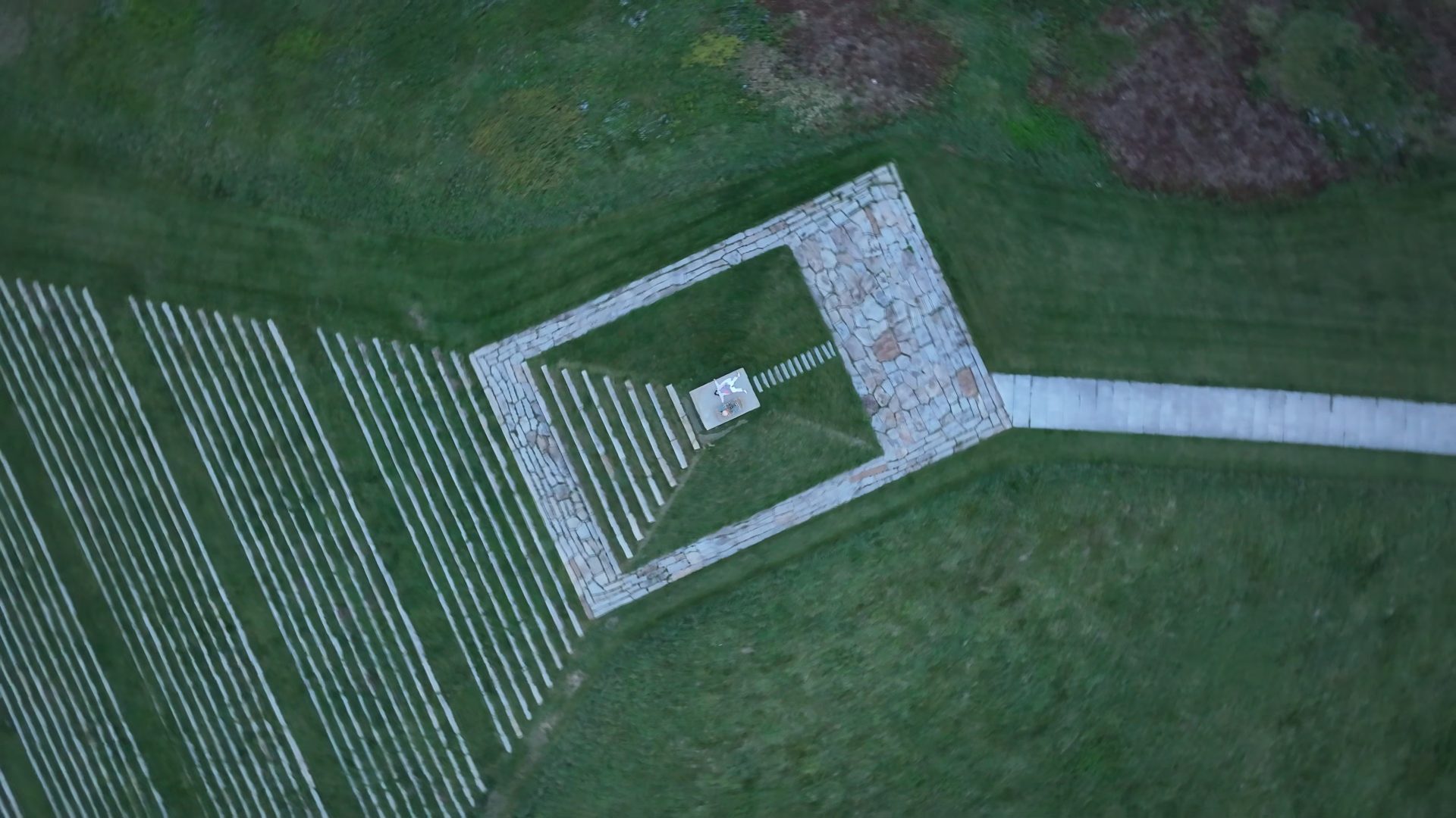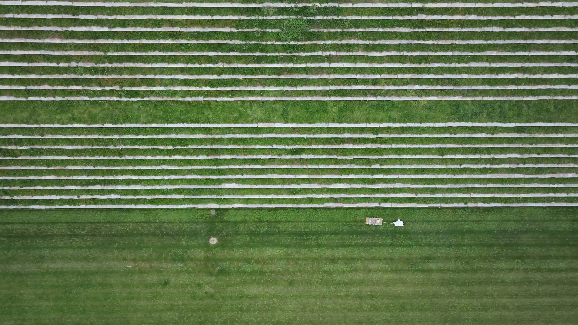 今回の旅の終わりに、モエレ沼公園を舞台にした映像作品が作られた。プレイマウンテンは高さ30mの小高い人工の山。基本設計を手掛けたイサム・ノグチが20代の終わりに「大地を使って彫刻作品を作りたい」と考えた案のひとつがこの公園で実現されたものである。一本道のスロープ、そしてその反対側には石段が続く、遺跡のようなフォルムの山。夜明け前のほの暗い光のなかに白い道が映る。ノグチの描いた大地の形をなぞるように渡部が「筏」を引きながら登って、下りていく。