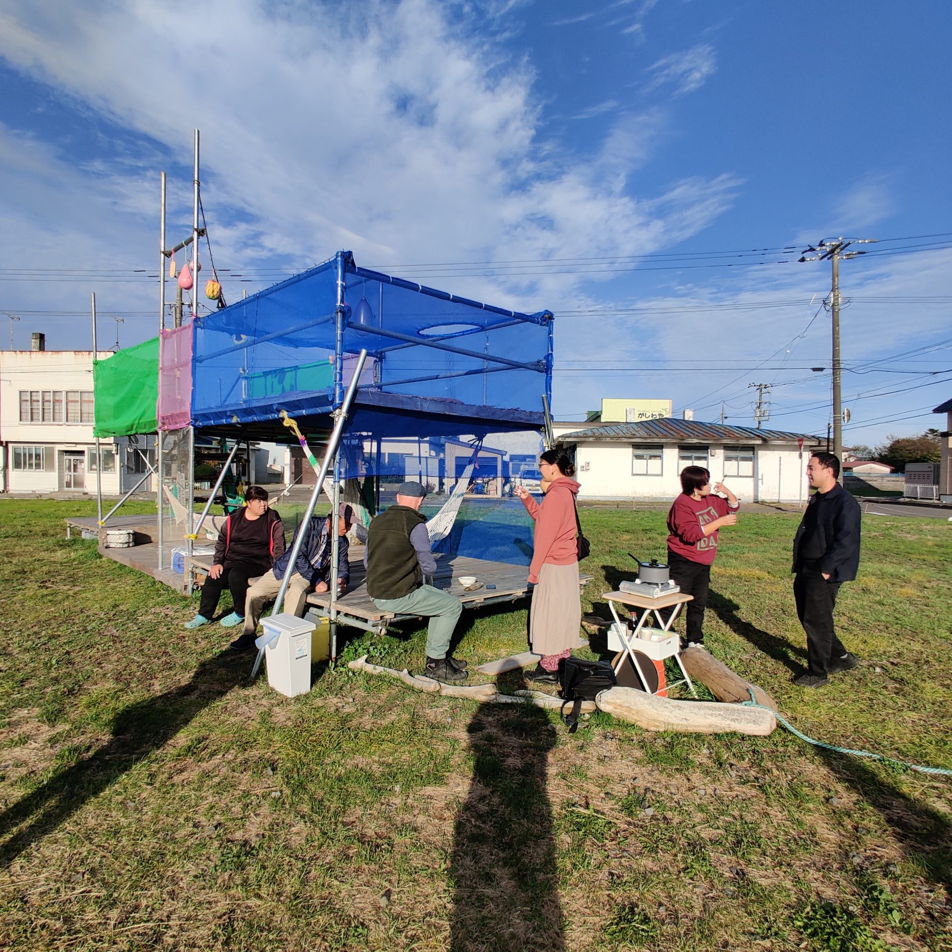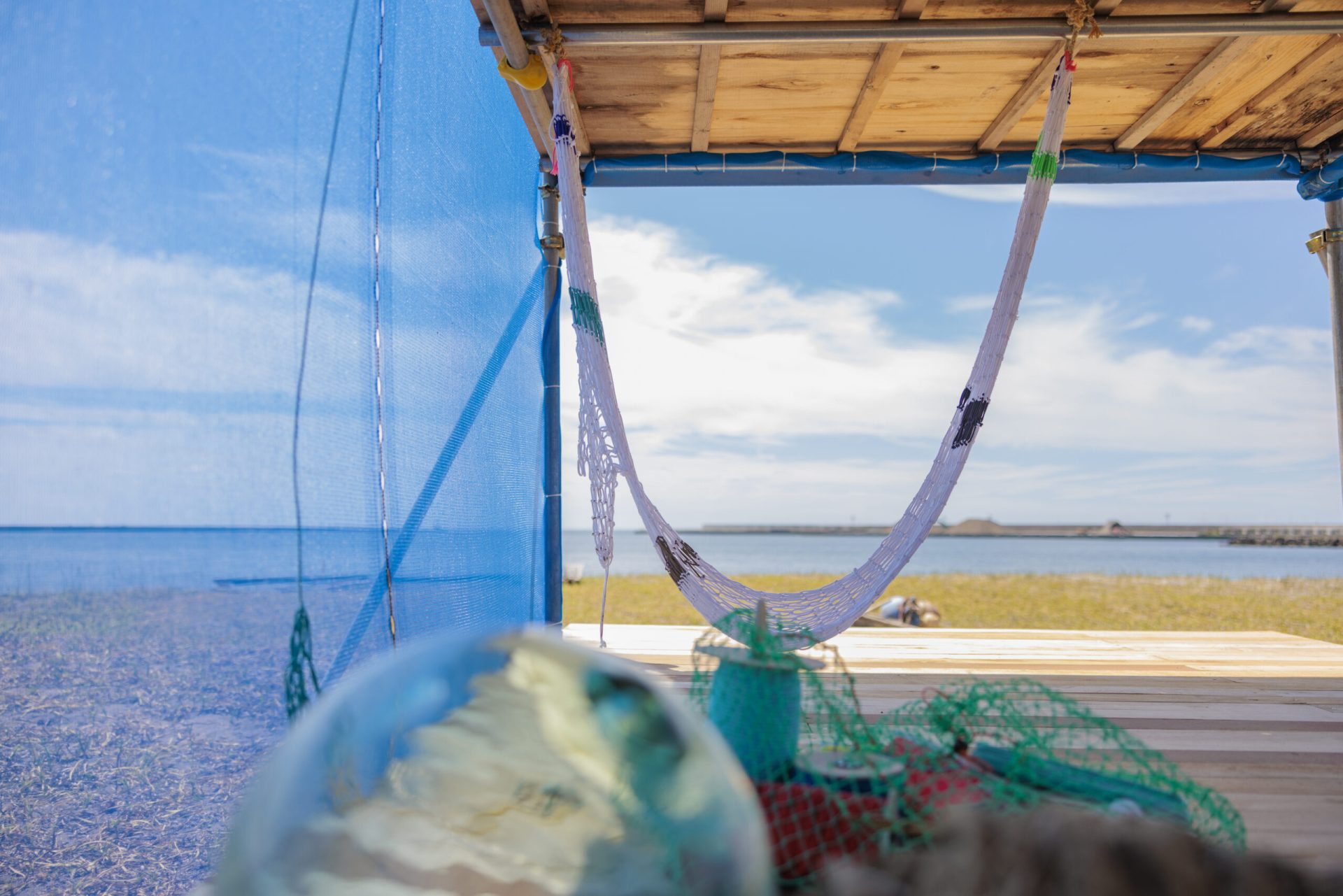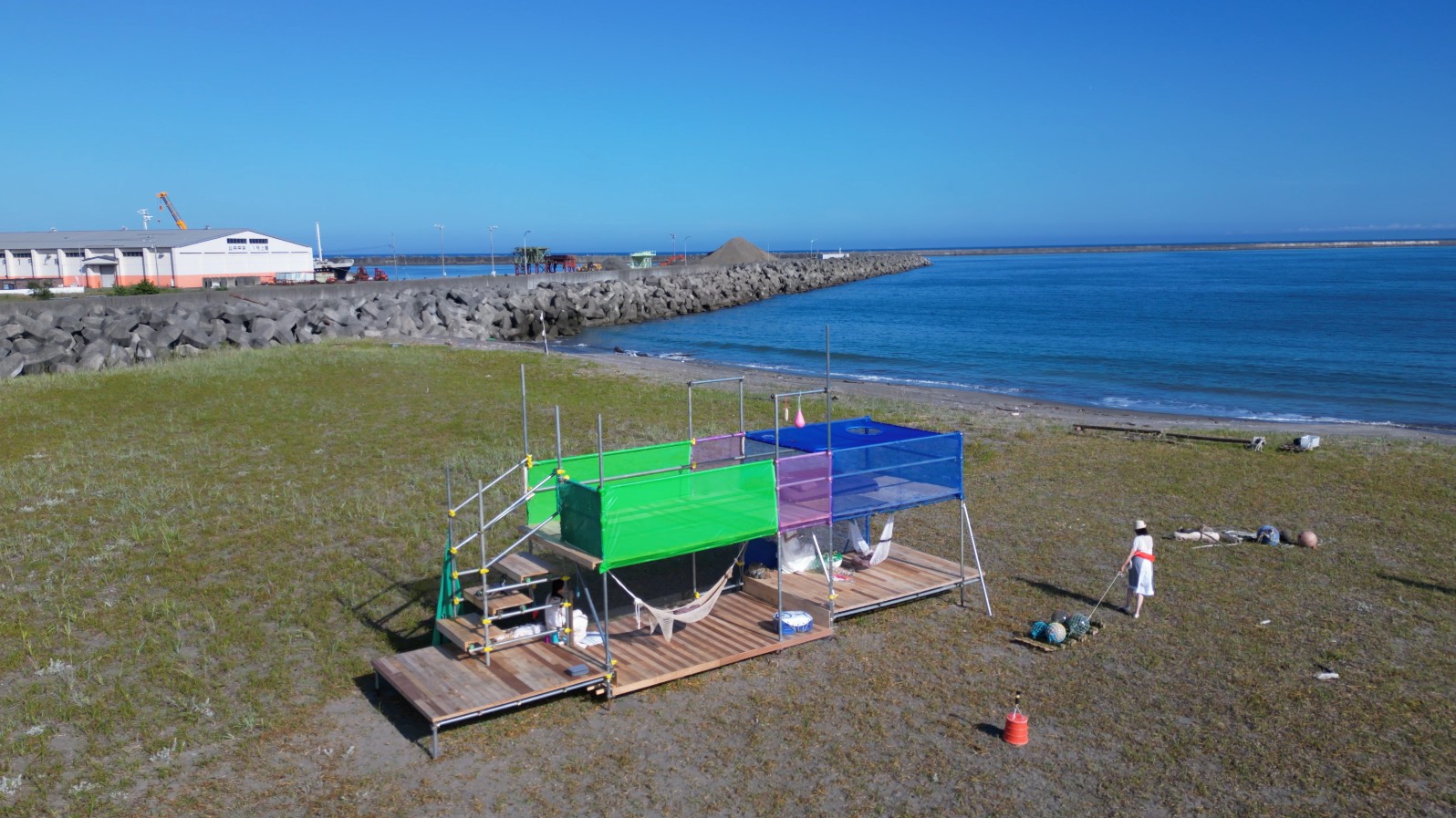 この白老でのひとつ目の舞台は7月から8月にかけて開催された「SHIRAOI Beach&海の家」(主催:一般社団法人SHIRAOI PROJECTS)だ。普段は使えない港の海岸を会場に“海の家”を模したコンテナハウスが設けられ、磯遊びやSUP、ビーチスポーツなどが楽しめるエリアができた。子どもたちの歓声が響き、ゆったりとした空気が流れるその一角に渡部が制作したのが、船や家を連想させるインスタレーションだ。