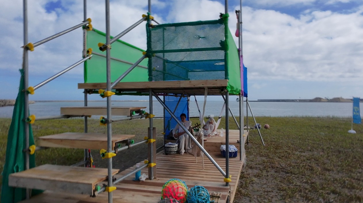 2階建ての大きな足場を組み上げた空間は、秘密基地のような親密な空気を持ち、リラックスした表情で人々を迎え入れる。1階部分にはハンモックが吊り下げられ、そこここにカラフルな海からの漂流物が並ぶ。訪れた人たちは階段を上ると、地上から見るのとは少し異なる広やかな視点でその場を眺めることができる。「船」の最も高い位置に張られたネットは、かつて縄文海進の時代に上昇した海面をイメージしているという。『空を編む―低い土地から』は渡部の作品集の日本語タイトルだが、このインスタレーションはまさに海抜0mの低い土地から空の間に架けられた階段であり、かつ、来訪者に柔らかな居場所を提供する。