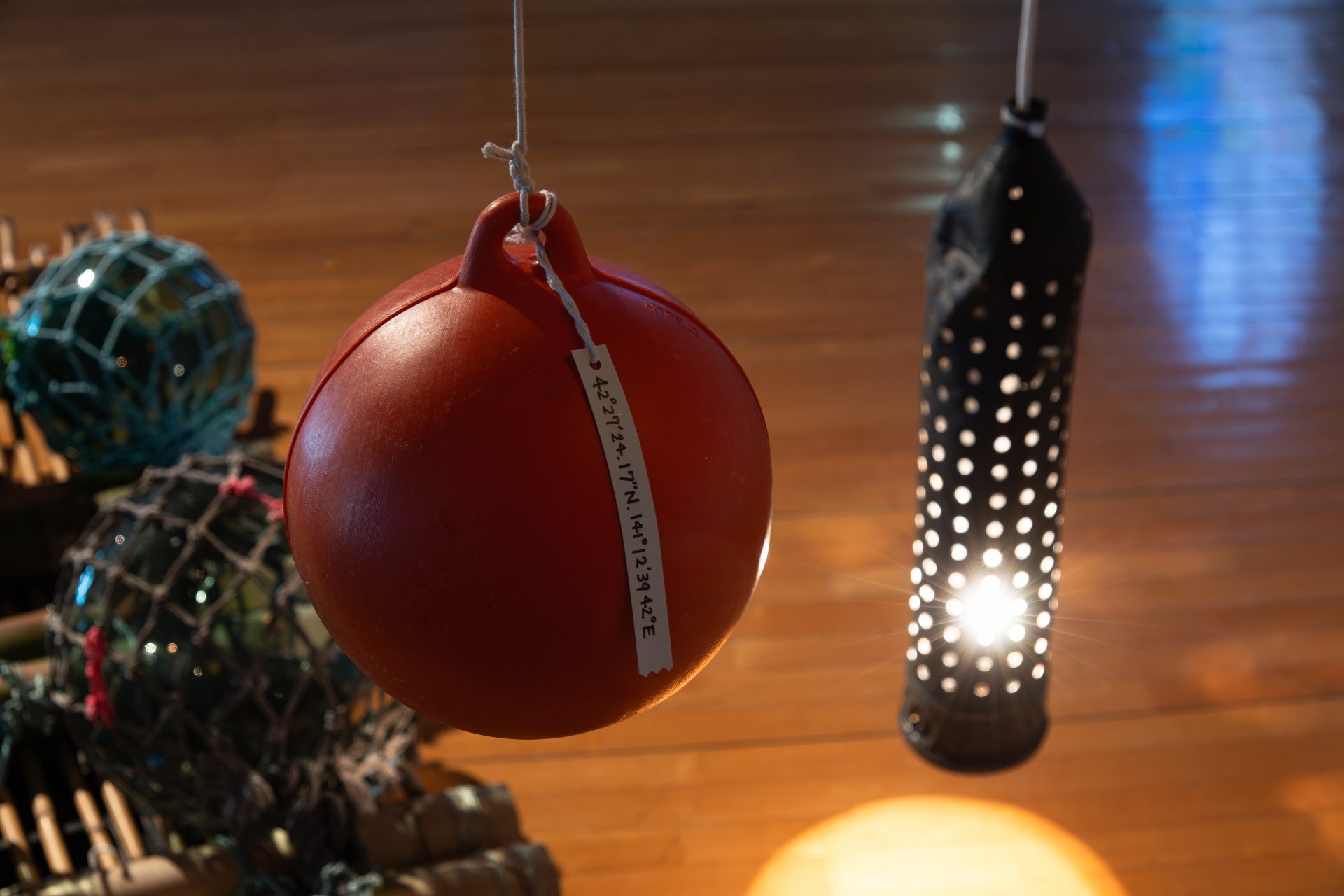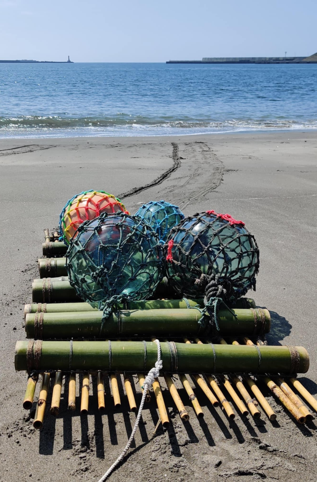 また、滞在期間中には、海辺で拾った漂流物、地元の漁師から借りたガラスの浮き玉などの古い漁具、地元の素材である根曲竹などを使って、筏(いかだ)のようでもあり、ソリのようでもある水陸両用の浮かぶオブジェを制作した。海に生きた先人たちの漁や交易、航海の労苦について思いを馳せ、その実践のひとつとして制作されたこの「筏」は、会期中に実施された渡部のパフォーマンスで使用され、今回の作品のなかでも重要な役割を果たすツールとなった。