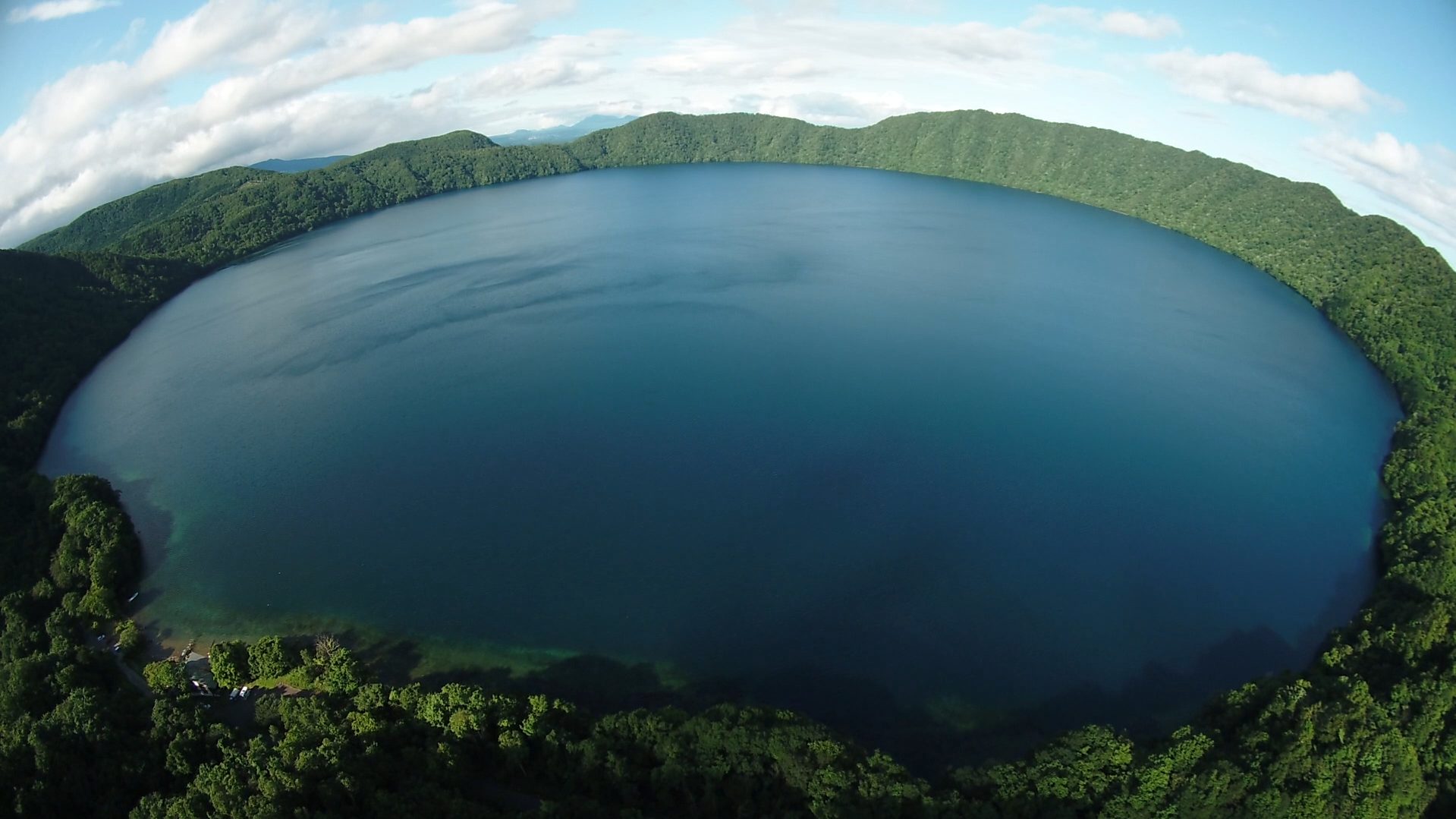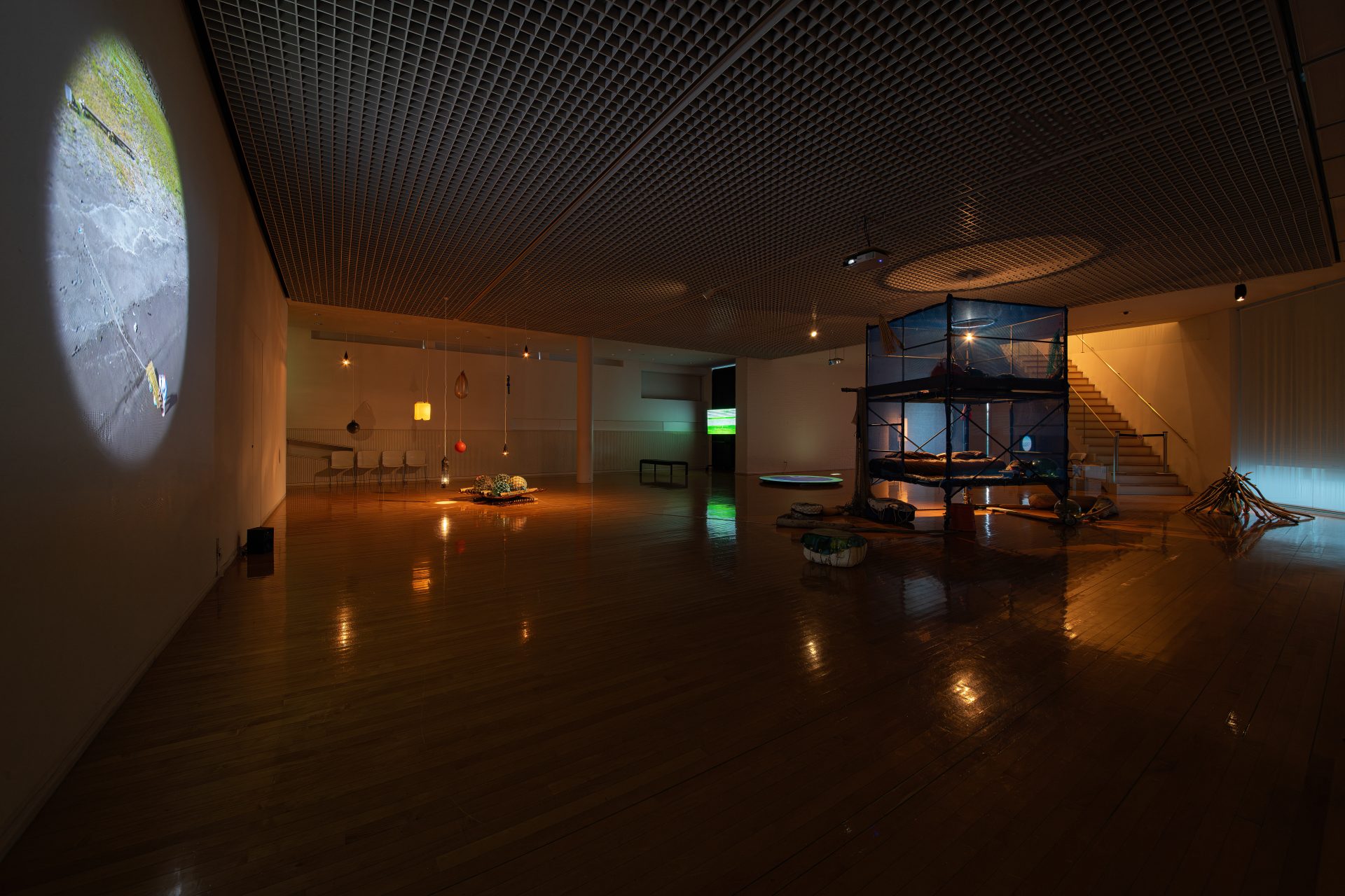 モエレ沼公園会場では四つの映像作品と、白老で制作された「船」よりふた回りほど小さいやぐら状に組まれた空間を中心に構成し展示を行なった。会場に入ると、暗闇のなか、丸く切り抜かれたいくつかの映像が目に入る。馬頭琴の音や水の湧き出る音、どこかの民族を想起させる伸びやかな歌声、そしてアイヌの子守歌が響く。中央に置かれた「船」は、中に入って寝そべることもできる。漂流物でつくられた小さな光。心地よい暗がりに広がる、丸くつながる世界。床に繰り返し映し出されるのは白老のカルデラ湖、倶多楽湖(くったらこ)だ。その日本一丸いかたちが特徴で、流入・流出する川がなく、青く透き通っている。その伏流水は大地に滲出し、湧水となる。時折鮭の遡上が映し出される。白老では秋になると海から川へと懸命に上る鮭を見ることができる。命を懸けて故郷へ戻り、死んでいく。その自然と生命の循環が映像を通して詩的に表現される。白老を舞台に撮影された映像作品だが、北海道という地域に特定されづらい、どこか遠く、物語のような世界を想像させる。