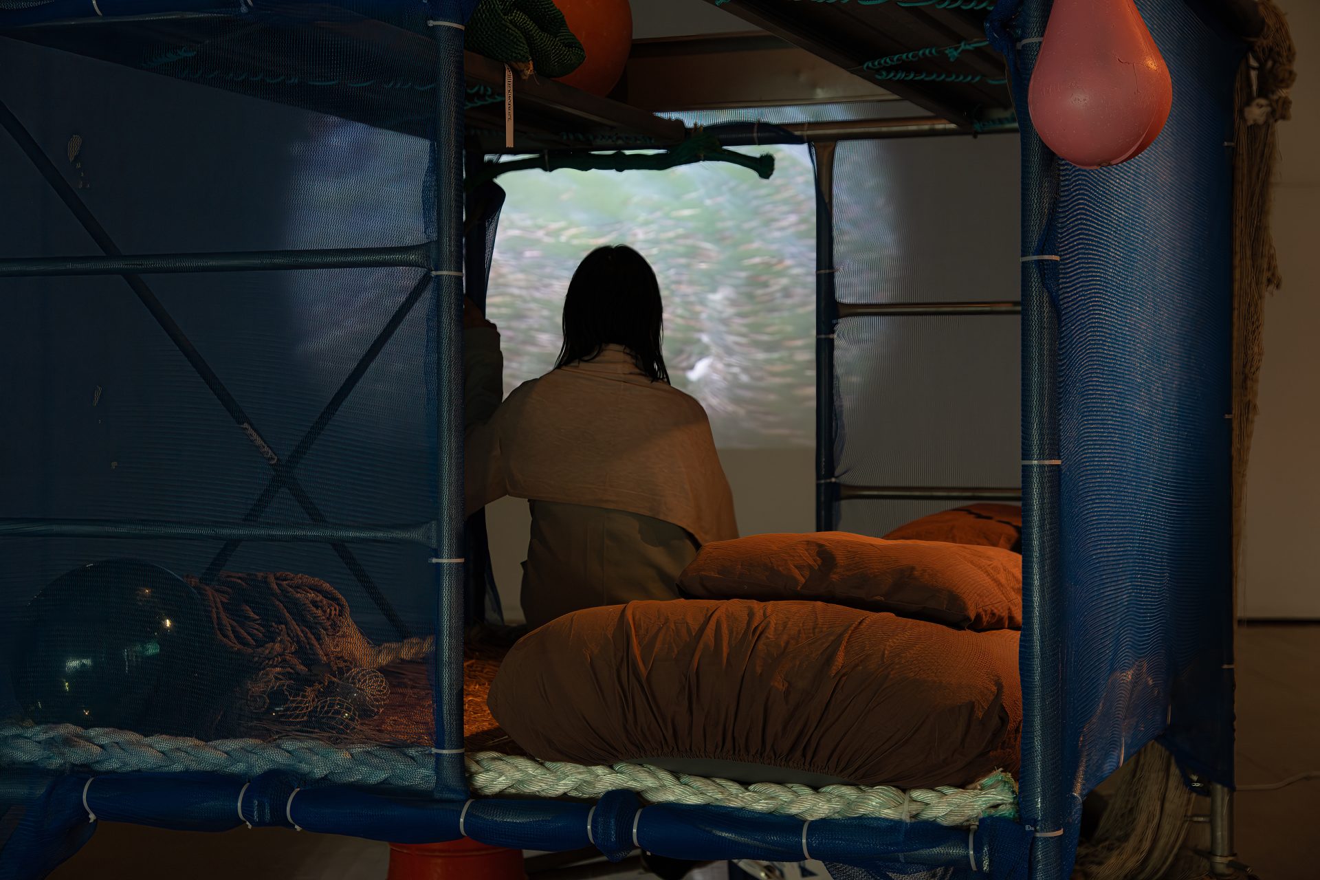 《サバイバル・ネット》は2000年から続けているプロジェクトで、衣服として着られて、魚が捕れ、かつハンモックにして寝ることもできる「衣・食・住」を表現する彼女のライフワークともいえる作品だ。