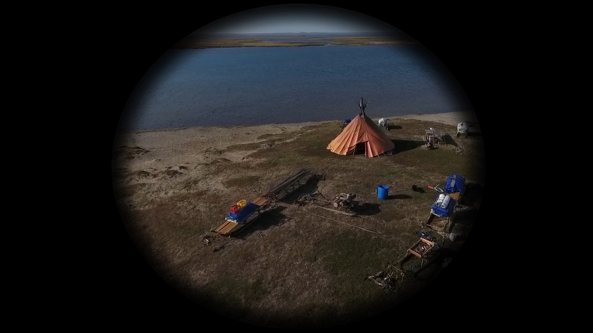 「NUM(ヌム)」はネネツの最高神の名称で「北極星は天空の神ヌムの目」という詩があるという。ネネツは星の中心で動かない北極星を道標に移動する。円窓から覗いたように丸く切り取られた映像は、他者の視点を感じさせる。それは作家の住むオランダの干拓地から、遠く北極圏へと飛んでいく渡り鳥の視点であり、遠くから覗き見る私たちの視点であり、星空から地上を見下ろすヌムの視点でもあるだろう。