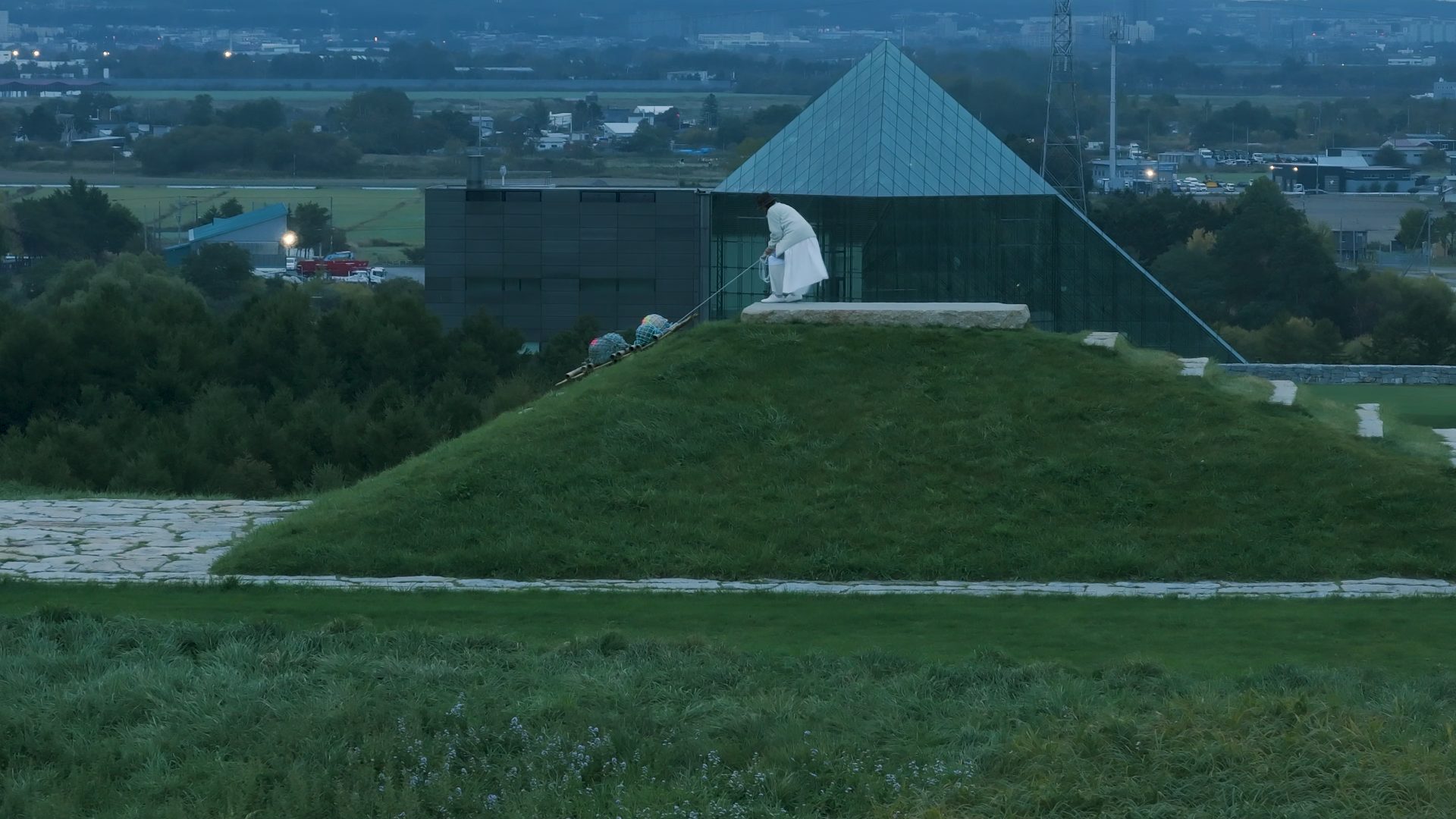 会期中にはこの映像を上映しながらのパフォーマンスを実施した。20年以上もの間コラボレーションを行なっているサウンドパフォーマーの川辺ゆかとMAMIUMU、そして渡部本人が出演した。日が陰っていくガラスのピラミッドに響くふたりの歌、鈴やグラスハープ、ムックリの音色。古代の時間と未来を接合する特別な空間がそこに立ち現われた。渡部の「筏」をひくパフォーマンスは空間に映し出された映像とひと繋がりとなり、この上空に、そして大地に広がりを与える一種の儀式のようであった。このモエレ沼公園での作品制作の最後の1ピースを埋める大切な時間となった。