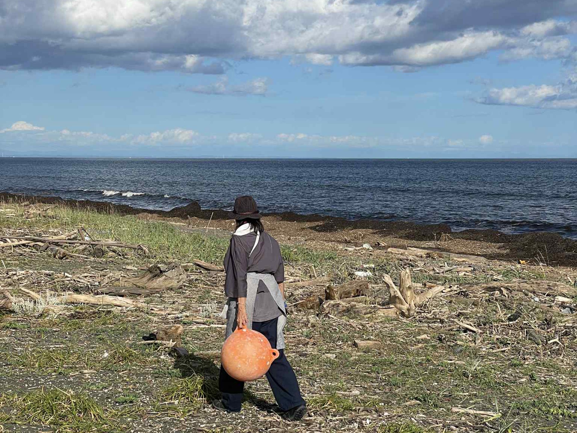 白老の海辺で作品の素材集めをする渡部[写真提供:一般社団法人SHIRAOI PROJECTS]