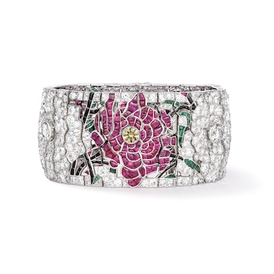 絡み合う花々、赤と白のローズ ブレスレット(1924)プラチナ、エメラルド、ルビー、オニキス、イエローダイヤモンド、ダイヤモンド