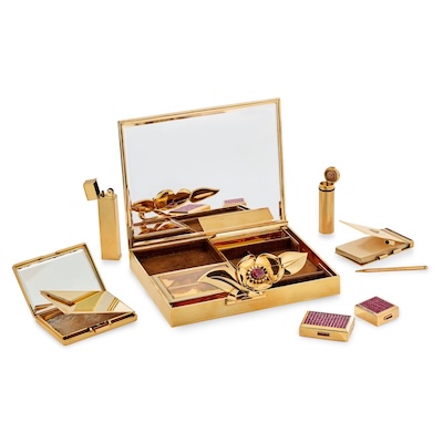 ヴァン クリーフ&アーペルはそうした詩情あふれる世界観を持つ一方、実は機能性を徹底的に追求した一面もある。例えば女性の外出時の持ち物をひとつにまとめた「ミノディエール」というケース。なかでも《カメリア ミノディエール》(1938)はそれ自体が美しいゴールドでできていて、装飾物のカメリア(椿)を取り外してブローチとして着用できるうえ、内部には時計付きリップスティックホルダーやパウダーコンパクト、ライター、ノート&ペンなどがシステマチックに収められているものである。ケースはバッグに忍ばせたり、クラッチとして持ったりできる。