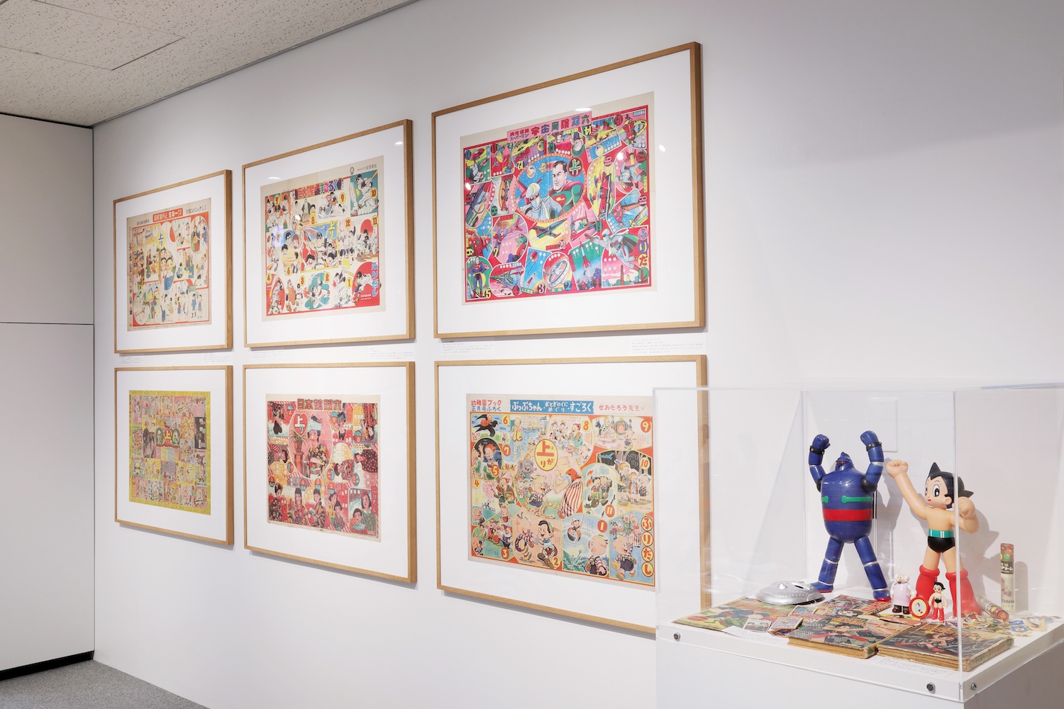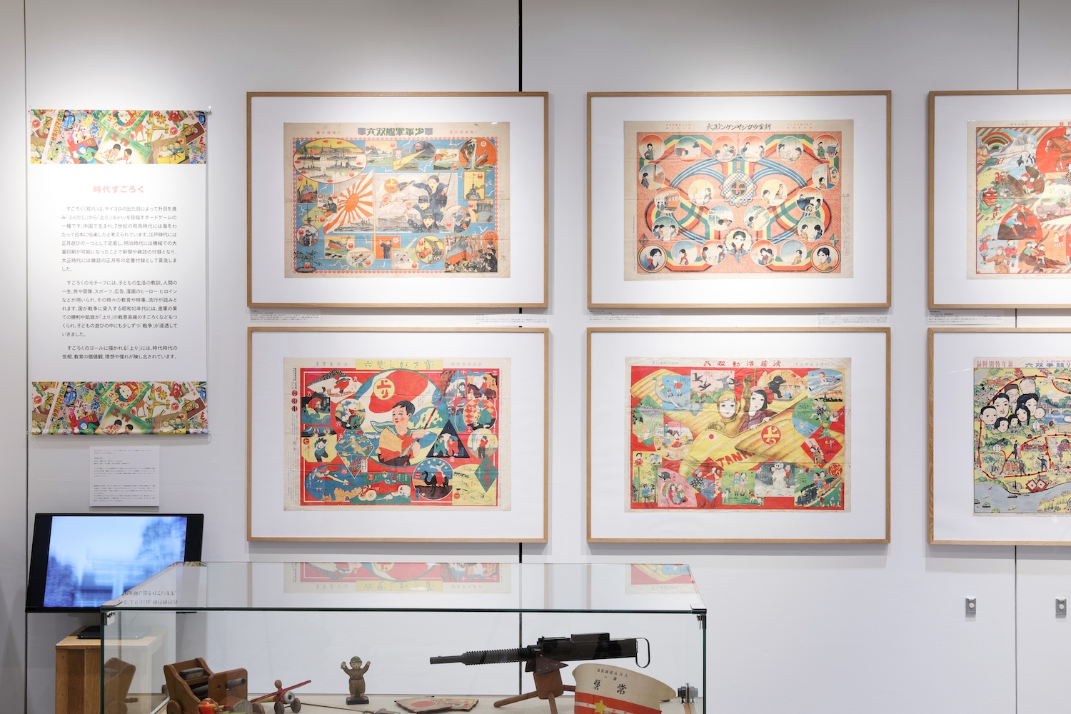 展示品のなかでも印象的だったのはすごろくだ。あるひとつのテーマを設け、ストーリー仕立てにして、絵と文字でスタートからゴールまで誘導していくこの手の玩具は、教育やプロパガンダにうってつけであることに改めて気がついた。大正時代には礼儀正しく、心身ともに健康で、家の手伝いも学校の勉強も毎日積極的に行なうといった模範生を描いたすごろくが流通するが、昭和初期にはまさに戦意高揚をかき立てる物々しいすごろくが出回ったようで、その描かれた内容のすさまじさに空恐ろしくなった。何事も吸収しやすい子どもへのその影響力たるや……。しかし戦後の高度経済成長期は一変して社会が平和主義に傾き、すごろくも温かく夢のある内容に変わっていく。また『鉄腕アトム』『月光仮面』『鉄人28号』といった漫画やアニメが台頭し、子どもたちを夢中にさせるヒーローが続々登場した。おそらく戦中での子どもたちのヒーローは「兵隊さん」だったのだろう。幼い子どもがどんなことに心を奪われやすいのかといった心理を巧みに突き、それを利用して軍国教育を行なった戦中の日本社会は、やはり罪が深いと思わざるを得ない。