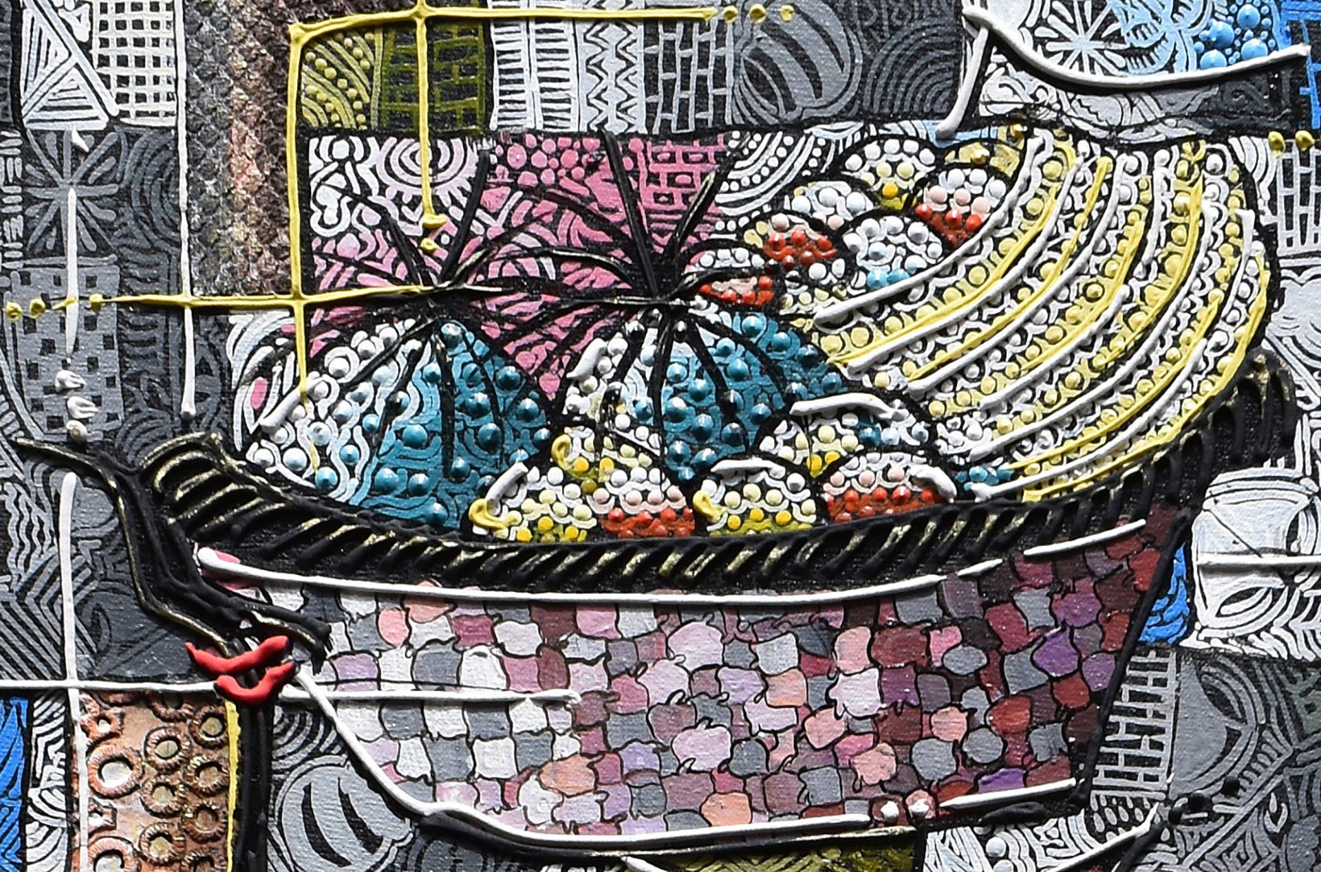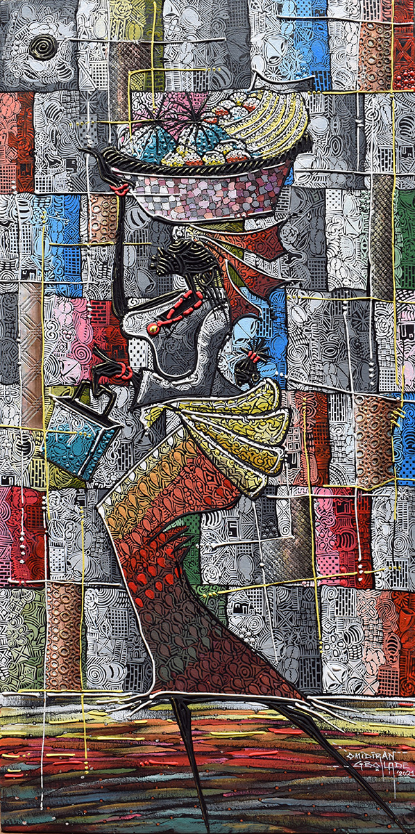 子を宿し育て、商売もして経済的な力にもなる女性の豊饒さがテーマである。画面全体に描き込まれた模様は、おおよそ縦10列・横7列に区切られた長方形をひとつの模様ブロックとして組み立てられており、青、赤、オレンジ、白などバランスよく配色されている。一方、足元には黄色やピンクなどの水平線が勢いよく描かれ、スピード感を出している。女性の独特のフォルムは、オミディランの特徴である。頭上には盛りたくさんの果物が入ったバスケット、左手にはかばん、背中には子供。女性と子供の顔は抽象的で表情はなく、背景に溶け込むように模様化し、環境と一体化した人間像を表わす。女性のネックレスとブレスレット、子供の髪飾りは共に赤い。子供をおぶり、堂々と大股で闊歩して果物を販売する、逞しく、豊かな女性。ヨルバの伝統的な模様とカラフルな色彩が描くのは希望あるアフリカの未来である。