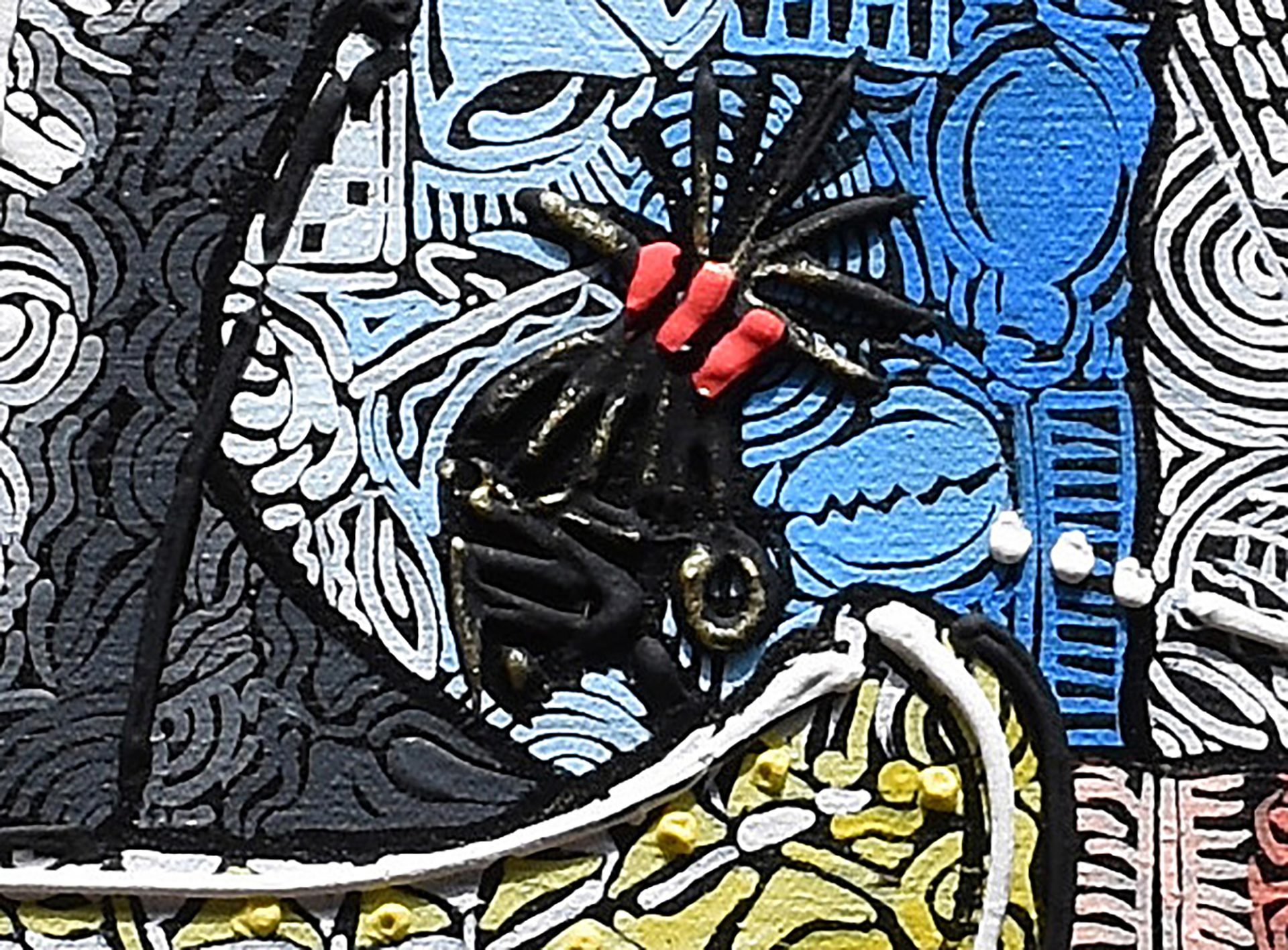 キャンバス、アクリル絵具、ミクストメディア(合成皮革と溶かしたプラスチック)。