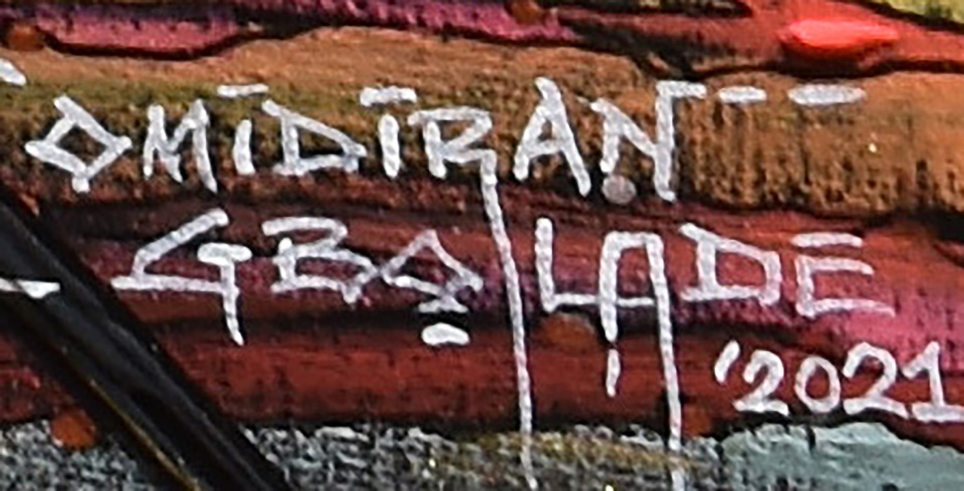 オミディランの絵画作品は、のどかな村の生活、市場、町並みなど、アフリカの伝統文化を主題とした油彩画やアクリル画である。これに、エマルション塗料と糊、または糊と砂を混ぜ、注射器を使って凹凸のあるラインを描いたり、ベニヤ板、プラスチック、木の実や種、石をキャンバスに付着させて部分的に立体感をつけたり、蛇皮やベルベットなどを、キャンバス代わりに利用したりする[図2]。プラスチックでコラージュを制作していたリベリア人アーティストのウイルソン・オホ(Wilson Oho)の影響を受け、ラゴスのヤバ工科大学の講師で画家のクンレ・アディエミ(Kunle Adeyemi)や画家コラデ・オシノウォ(Kolade Oshinowo)にも感化されたという。2014年にはイレ・イフェ初のアートギャラリー「オミディラン・ギャラリー」をオープンした[図3]。