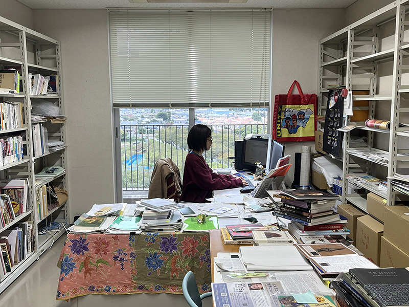 緒方氏のPCの画像に目が留まった。カラフルなひとりの女性が描かれた絵画作品だ。人物と背景が一体化して見えた。細部には記号のような模様が描き込まれ、色彩豊かに絵画全体が輝いていた。ボラデ・オミディラン《実り豊かな女性》(作家蔵)である。どのような作家なのだろう。作品には何が描かれているのだろうか。《実り豊かな女性》にまつわる話を伺うため、緒方氏がオミディランが暮らすナイジェリアでの調査から帰ってきた直後に、再び東京・府中にある東京外国語大学の研究室を訪ねた。