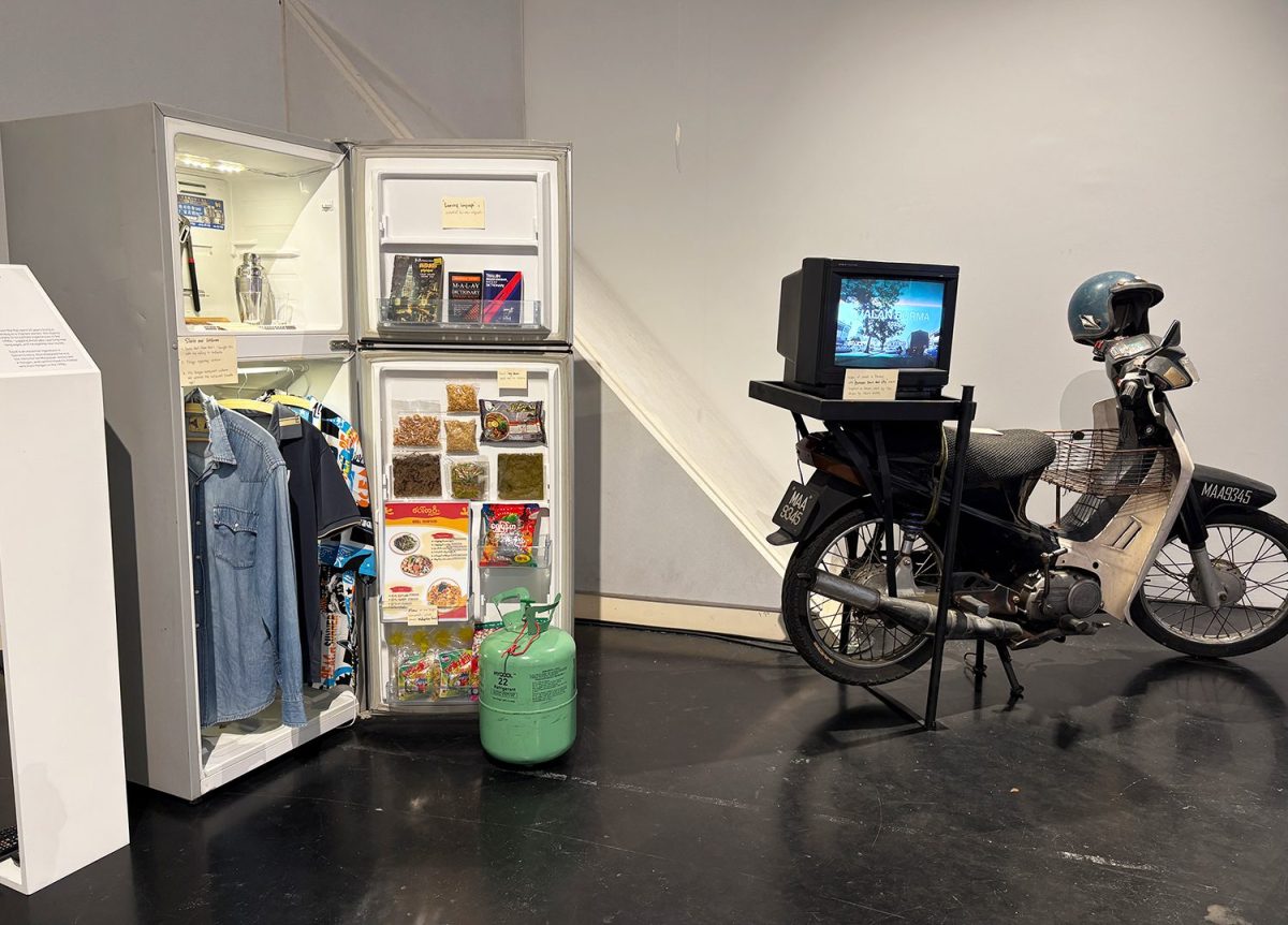3階で開催されていた「POLLINATION」というシリーズ展はチェンマイを拠点に活動する非営利のアート&リサーチプラットホームであるインタンジブル・インスティチュートが立ち上げた東南アジアのアート・コミュニティをつなげる共同リサーチプロジェクトで、毎回異なる協働者と共に実施されてきた。今回はイルハム・ギャラリーが共同主催者となり、クアラルンプールのアーティスト/リサーチャー/キュレーターであるマーク・テとミャンマー出身の研究者/キュレーターであるダイアナ・ヌエイ・トゥエ(Diana Nway Htwe)を迎え、4名の協働者とともに2024年から活動が開始された。クアラルンプール、ペナン、ヤンゴンを主な拠点に、アーカイブ調査、コミュニティとの対話、共同マッピングなどを実施し、その成果としての展覧会が「POLLINATION 4: the palms of y/our hands」である。本展でとりわけ興味深いのは、アーティストではない二人の人物──ひとりはマレーシアで暮らすミャンマー移民、もうひとりはミャンマーに住む学生──が、作品の共同制作者として位置づけられている点である。このプロジェクトにおいて、彼らは取材対象でも参加者でもない。彼らの語りや日常の道具そのものが展示の核となり、個人のリアルライフから浮かび上がる移動と労働の歴史は圧倒的な説得力を持っていた。