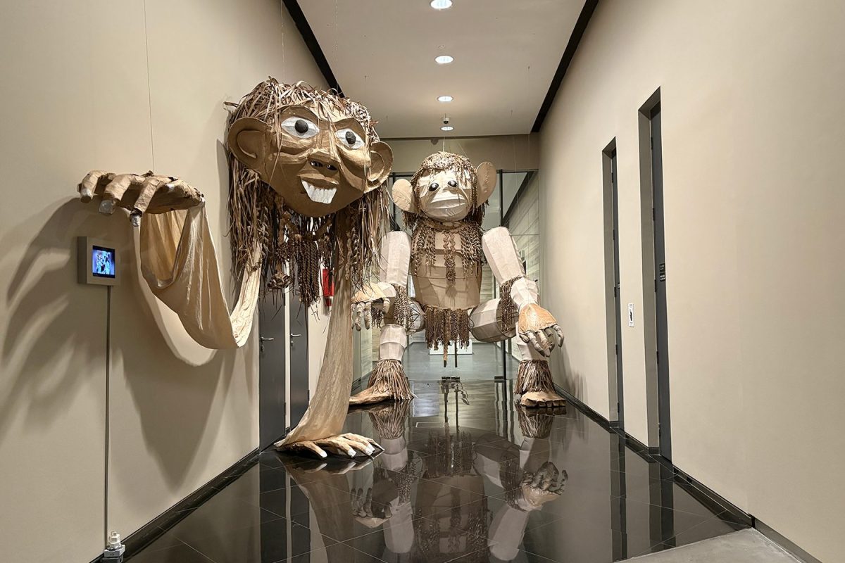 アーティスト・コレクティヴ「AWAS!MAWAS!」とマレーシアのスンガイ・ブンブン村およびプラウ・ケンパス島の子どもたちによるプロジェクトで制作されたパペットたちと、パレード・パフォーマンスの記録映像による展示風景[筆者撮影]