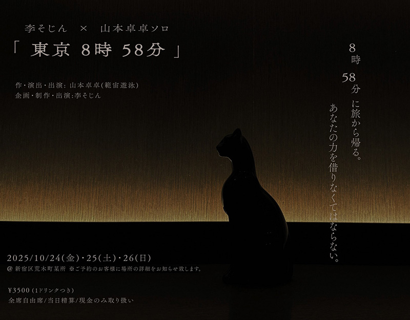 俳優の李そじんと作家・演出家・俳優で範宙遊泳の代表でもある山本卓卓による二人芝居『東京8時58分』(作・演出:山本卓卓)が上演された。会場となったバーの雰囲気を活かした男女二人の会話劇は、上演時間40分の短編ながらその設えも相まって満足度の高い仕上がりとなっていた。