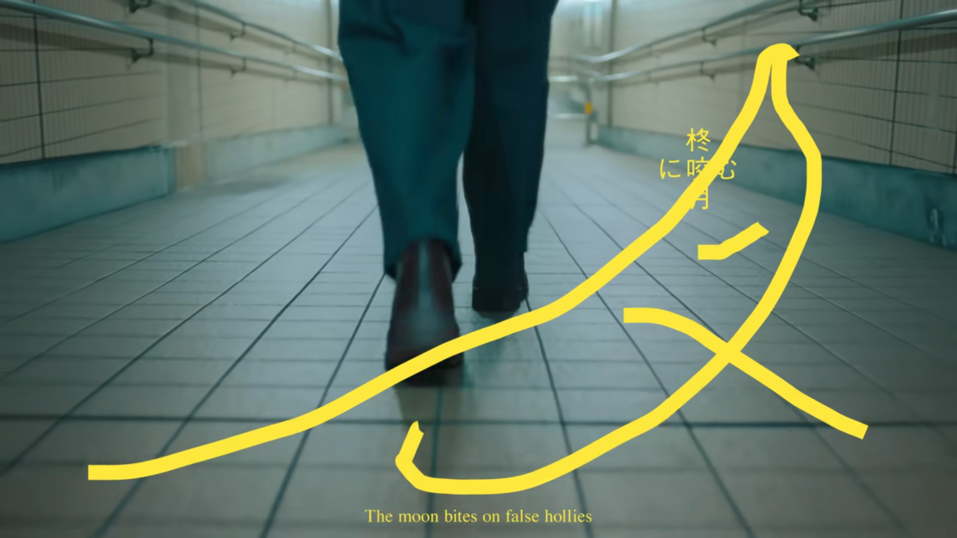 ではその美学はなにに由来しているのか。それはグラフィックデザインに他ならない。岡本のMVにおける文字組の特徴は、一見アンバランスな構成と、文字と文字の間隔である。これはライター/ネットワーカーのばるぼらも指摘するように、仲條正義を主要な参照点として2000年代に入って以降、菊地敦己や服部一成らによって本格的に展開されたものでもある。服部に関しては岡本自身もその影響を認めており★1、「Star」MVでは歌詞に登場する「月」や、曲名である「Star」などがラフな描線で描かれていることが両者の関連性を想起させるだろう。