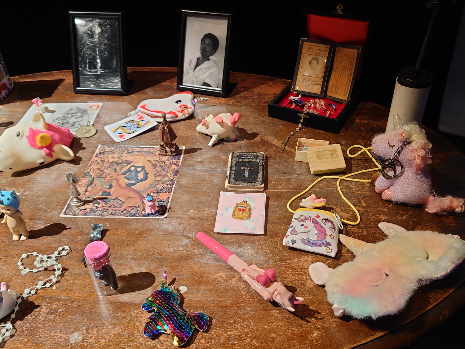 「レディ・ホルン」という名前が召喚されるように、本作の着想源のひとつが、身体機能の拡張であり、かつ拘束具のような装置を着用したレベッカ・ホルンの初期パフォーマンス作品である。《ユニコーン》(1970)では、身長を半分ほども延長する白く長いツノを頭に装着し、バランスを保ちながら麦畑を横切っていく。また、「物語を書く百本の鉛筆」というカデナスの詩の一節は、ホルンの《ペンシル・マスク》(1972)も想起させる。アメフトのフェイスガードのようなグリッド状のマスクを頭部に装着し、グリッドの交点に「ツノ」のように鉛筆が取り付けられているため、頭を動かすことでドローイングを描くことができる。「腕を動かすことができなくてもドローイングできる」という身体機能の拡張と同時に、拘束具のような抑圧性や攻撃性をも帯びた作品だ。ホルンの《ユニコーン》を収めた写真立ては、ユニコーンのグッズが並ぶ祭壇のような空間に飾られていた。